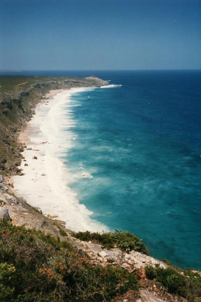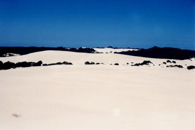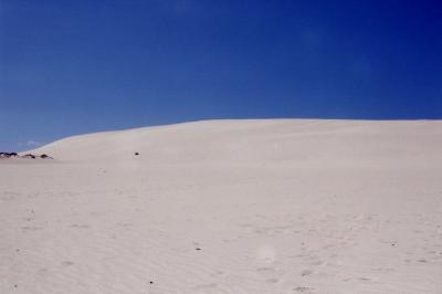 シール・ベイからサウス・コースト・ロードに戻って、西へ少し進んだところにリトル・サハラという白砂の砂漠がありました。余談ですが、訪れた当時のこの道は未舗装で、もうもうと赤銅色の砂塵を巻き上げましたが、今は綺麗に舗装されています。オーストラリア特有の赤土の中で、突然の白い砂漠なので感動をします。有料のアトラクションもありますが、自分の足で砂丘を登る分には無料です。全体の広さとしては4~5k㎡くらいあるそうですが、海岸線からは2~3kmくらい離れているはずなので不思議です。砂丘の高さは1番高いところで2~30mくらいだと思いますが、登るには結構疲れます。やっと登りきると、ぐっと見晴らしが良くなりますが、風が吹くと吹き上がってきた細かい砂が顔に当たり痛いです。鳥取砂丘などの砂に比べると粒子がもっと細かい感じがしました。