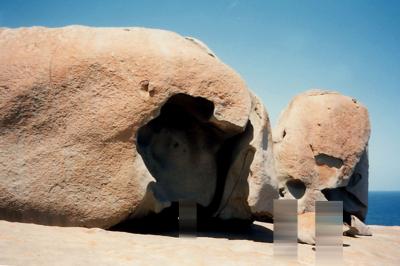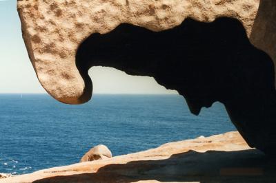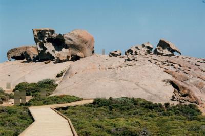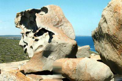 フリンダーズ・チェイス国立公園内で、アドミラル・アーチと並ぶ観光スポットがリマーカブル・ロックスです。ともに、カンガルー島の南西端辺りにありました。だいぶ離れたところからも、南極海の荒い波が打ち寄せる海岸が続くずーっと先に、目立つ岩群が見えました。海岸近くの高くて大きな岩棚の上に奇妙な形をした大きな岩がいくつか集まって乗っかっていました。大きなものは10m以上はありそうです。その中で1番目立つ岩は、象の鼻の様に垂れ下がっている岩です。鼻の先端は手を伸ばすと届きます。各国からの観光客も考えることは同じで、みんな手を伸ばして(背の高い外人は頭が届きそうです)記念撮影をしています。やっと人が通れる様なアーチ状のものや人が隠れる程度の穴の開いた岩などがたくさんありました。これらが乗っている岩棚は緩やかなカーブを描いてそのまま海に落ち込んでいます。乗っている岩がごろんと転がっていきそう・・・と思われるくらい不安定な感じです。どうしてこんな姿になっているのか誠に不思議なところでした。