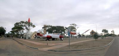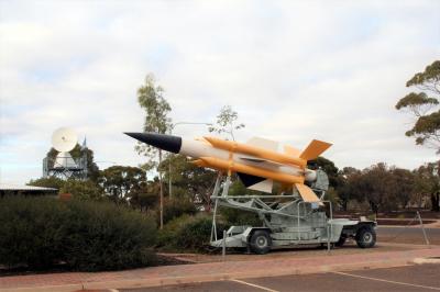 近年、日本のJAXAが打ち上げた小惑星探査機「はやぶさ」の地球帰還地点として話題になったのがオーストラリアのウーメラ近郊でした。そのウーメラはオーストラリアの戦闘機やミサイルの研究、そして、宇宙開発基地の役目を担っているところです。日本でいえば、種子島宇宙センターや内之浦宇宙空間観測所の様なところです。アデレードからスチュアート・ハイウェイを北へ500kmくらい進んだところのピンバから脇道を7kmくらい進んだところにウーメラがありました。一般の住民は住んでいなくて、関連施設やその所員などの住宅のみがある町です。その町の一画にウーメラ・ロケット・パークがありました。ロケットや戦闘機、ミサイルなどが屋外にそのまま展示されていました。スチュアート・ハイウェイは単調な長距離運転となりますから、ちょっと息継ぎにぴったりの場所だと思いました。