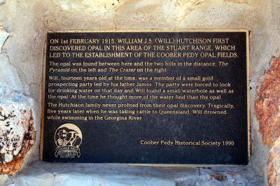 その当時はオパールの価値がそれ程なかったそうで、泉の発見には喜びはしても、ハッチンソン一家もオパールで生計を立てることは考えもしなかったそうです。その5年後、可哀想なことに、ウィルは牛をクィーンズランド州へ運んでいる時、途中の川で水浴中に溺れ死んでしまっとのことです。クーバー・ピディのメイン通り名に、ハッチンソン通り(Hutchinson St.)としてその名を残しています。