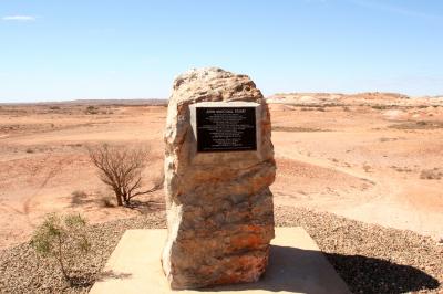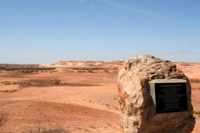 アデレードからのスチュアート・ハイウェイが、クーバー・ピディに入る少し手前に小さな記念碑が建っていました。「オパール発見記念碑=ハッチンソン記念碑(Hutchinson Monument)」です。ここは1915年2月1日に、ウィリアム・ハッチンソン(通称ウィル)が最初のオパールを発見した場所とのことです。ウィルはこの時14歳で、父親のジェームスが率いる小人数の金鉱脈探索チームの1員だったということです。ウィルが父親に命じられて、飲み水を探していたところ小さな泉を見つけ、そこでオパールを発見したそうです。この碑の周りに撒かれた小石は白い色をしていて、オパール特有の輝きを感じさせました。もっとも、白い石はオパールとしてはまったく価値のない石で、単なる屑オパールだそうですね。
