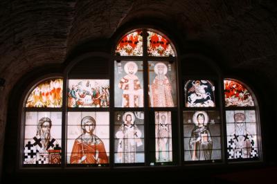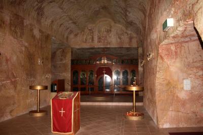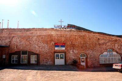 地下にあるセルビア正教会は、クーバー・ピディの町並みの南東の外れで、丘を下ったところにありました。この教会はこの地に住む150人のセルビア人のために、1995年に造られたもので、クーバー・ペディを代表する建造物とのことです。垂直に削り取られた岩の壁に、入口ドアや窓などが填め込まれていました。中に入ると、下り坂となった10mくらいのトンネルがあり、降りて左に曲がると、3段の緩やかなカーブを描いて掘られた天井を持つ、立派な教会の身廊がありました。祭壇が最深部となりますが、その反対側は、明かり取りの窓が設けられていて、そこにはステンド・グラスが填められています。宗教画の他に、丸いカーブのあるところの4ヶ所に花の絵が填められていますが、ステンド・グラスでこういうものを描くのは非常に珍しいものだそうです。なお、この花はスターツ・デザート・ピー(Sturt's Desert Pea)という豆科の植物だそうで、花の大きさは10cm近くあるそうです。外は30度近くになっていましたが、室内は嘘の様に涼しく感じました。地下にこういう施設を造った人々の気持ちが良く分かりました。