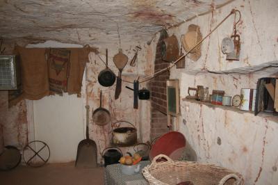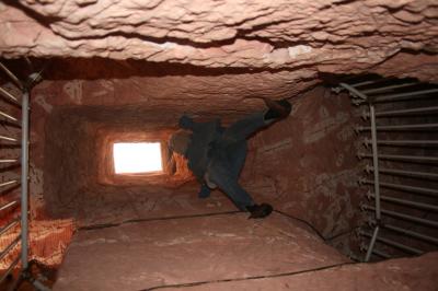 ここではヘルメットを被り、その鉱山内部を見学することが出来ます。迷路の様に掘り進んでいて、鉱脈らしきものを見つける度に、無計画に掘り進んでいった様子が窺えます。掘り掛けの岩壁のところどころにオパールの原石が埋まっています。といっても、あまり価値のないものの様です。でも、何ヶ所かには20、000~40、000AUドルなどと表示板が架かっていますから、真面目に探したら、まだまだ宝が眠っているのでしょうかね。地上からの進入口となる幅1mくらいの縦穴があります。高さは7~8mくらいあるでしょうか。この縦穴の上には小さなウィンチを設置して、掘り出した土砂を麻袋などに入れて、仲間(家族?)が巻き上げていたのでしょう。こういう1つの縦穴と無数の横穴を見ていると、大きな蟻の巣の様な感じがしてきます。その当時の採掘道具も展示されていますが、すべて体力に頼るものばかりですから、さぞ大変な作業だったのでしょう。また、今は明かりが点いていますが、当時は蝋燭などの明かりを頼りの作業だったでしょうから、一層困難なことだったと思われました。また、この鉱山の1段上には後年の住居部分があります。窓がないだけで、リビング、ダイニング、キッチン、ベッド・ルームなど結構広い住居となっていました。- 旅行時期