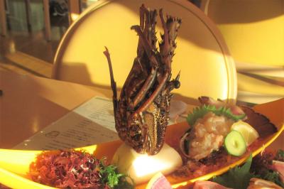 今回初めて宿泊し、伊勢海老・旬魚・黒毛和牛会席コースを利用しました。楽しみにしていた伊勢海老のお姿にびっくりしてしました。活き造りの象徴?である長い触角はすっぱりと切り取られて無残な姿で、大根の塊の上に載せられていました。やっぱり料理写真と異なり、また、活造りのイメージから大きく異なるとガッカリしますね。なお、刺身の方は特長のぷりぷり感はなく、一手間、二手間加えられている感じがしました。