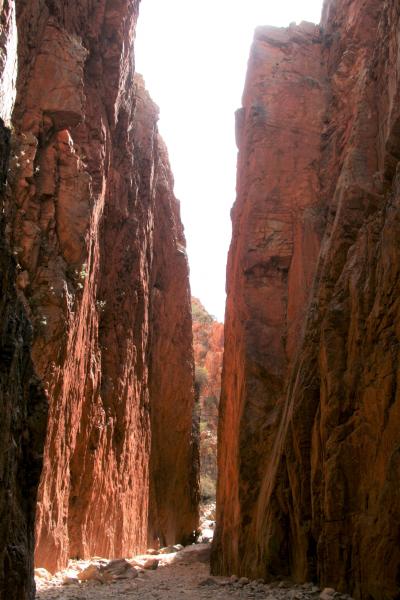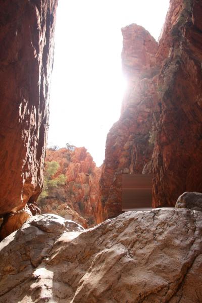 スタート地点では50mくらい幅のあった谷間が徐々に狭まり、行く手を塞ぐ様になった一画だけが開いています。ここがスタンドレー・キャズムの入口です。そこに入ると、高さが80mあるという険しい岩山がドッドッドーンと立ち上がっていて、その間に造り出された狭い隙間に達します。これはなかなかの絶景です。陽の光は、左側の壁から当たり始め、徐々に底を舐め、右側の壁へと移っていきます。日の当たっている岩肌は温もりがあり、当たっていないところのひやっと冷たい岩肌との対比が面白いところです。30~40mの長さの狭い隙間はわずかにカーブを描いています。その隙間の出口は大きな岩が転がり落ちていて、3~4mの壁を造り、隙間の先を塞いでいます。