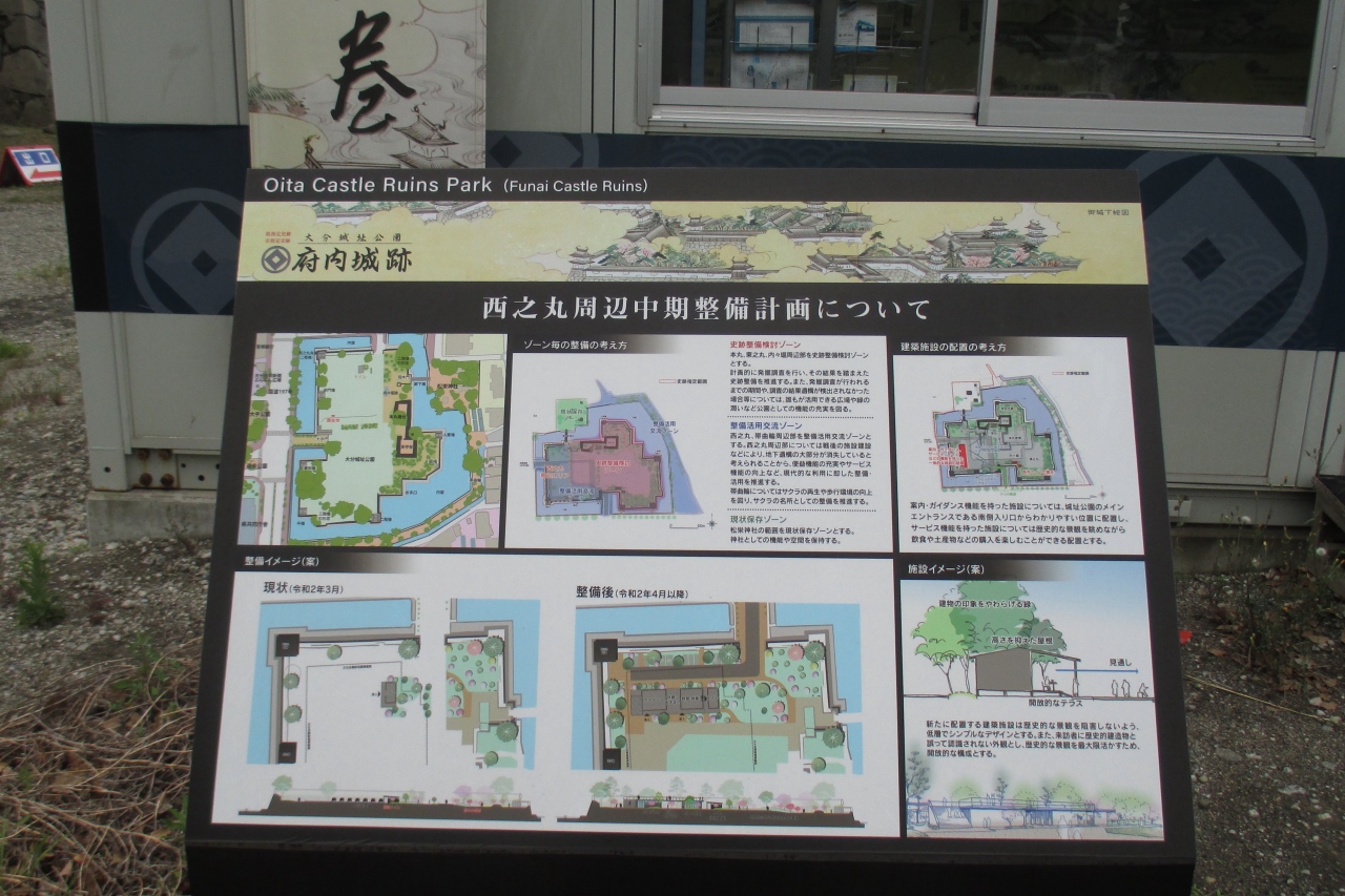 本丸、東の丸、西の丸の間にあった内堀は埋め立てられて、府内城跡は大分城址公園として整備されたそうですね。埋めないでお城としての形を残したまま、城址公園とすることは出来なかったでしょうか。残念なことの様に思います。現在、西ノ丸整備計画が進行中でした。ガイダンスと飲食の建屋などを建てるようです。期待する物からはどんどん離れたものになっていく様に思いました。