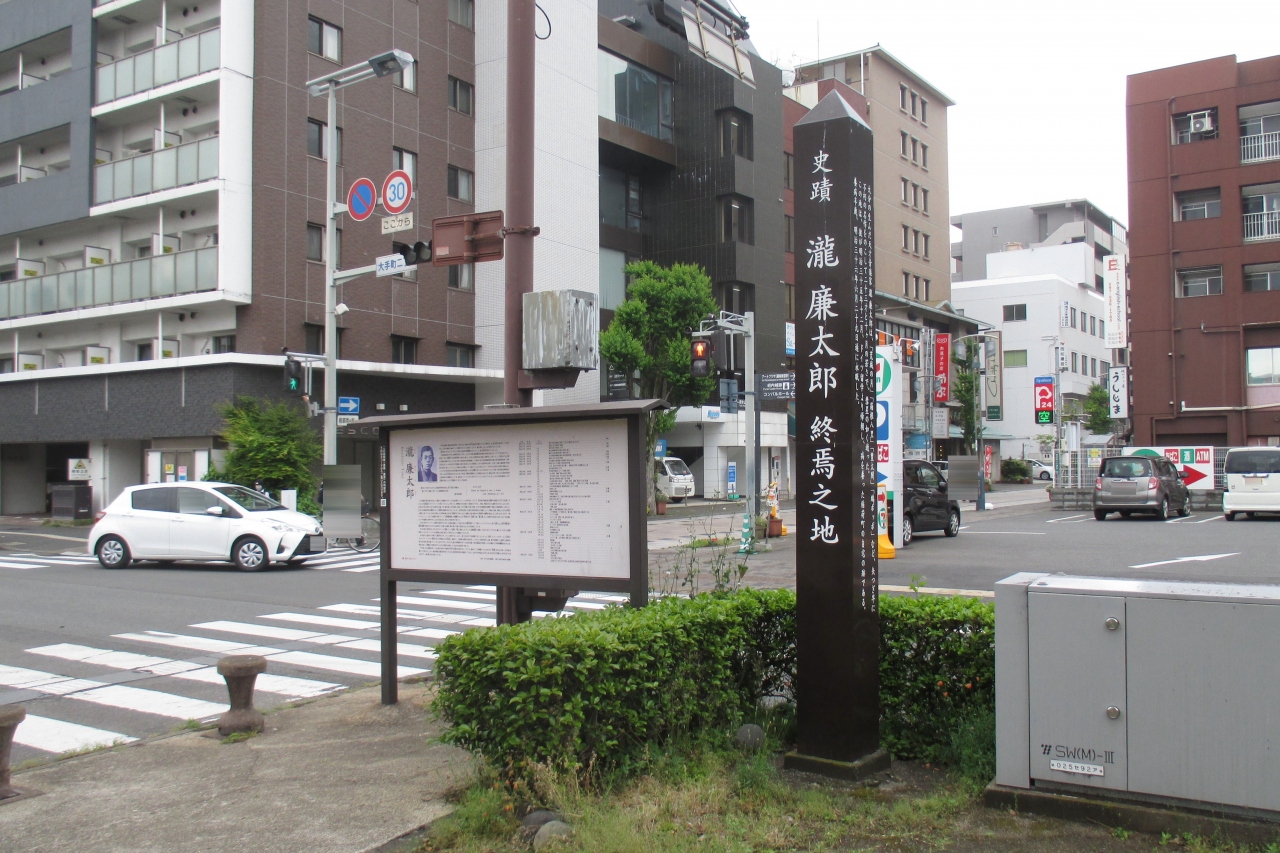 瀧廉太郎終焉の地と書かれたものが遊歩公園にありました。瀧廉太郎が、23歳10ヶ月という短い生涯を閉じたのは、ご両親が住んでいた家とのことです。その家は、正確には、すぐ横にあるサンサン通りに入って数軒目のサイクルショップ「コダマ」の前辺りだったそうです。サンサン通り東端の交差点を越えたところに、大分県出身の朝倉文夫さん制作の瀧廉太郎像が置かれていました。(廉太郎との関わりを書いた文夫自筆の文が刻まれています)大分県では竹田の岡城址や日出町に置かれているのも同じ彫像ですが、設置は制作年の1950年(昭和25年)ですから、1番早いものとなります。