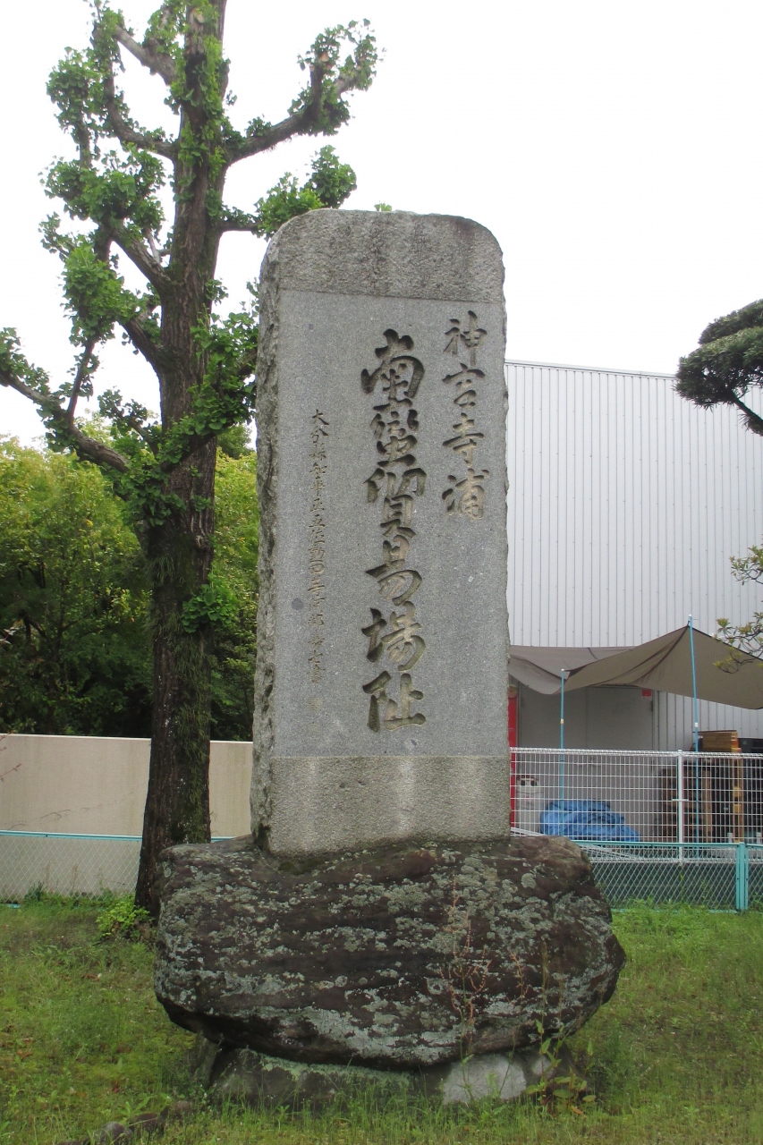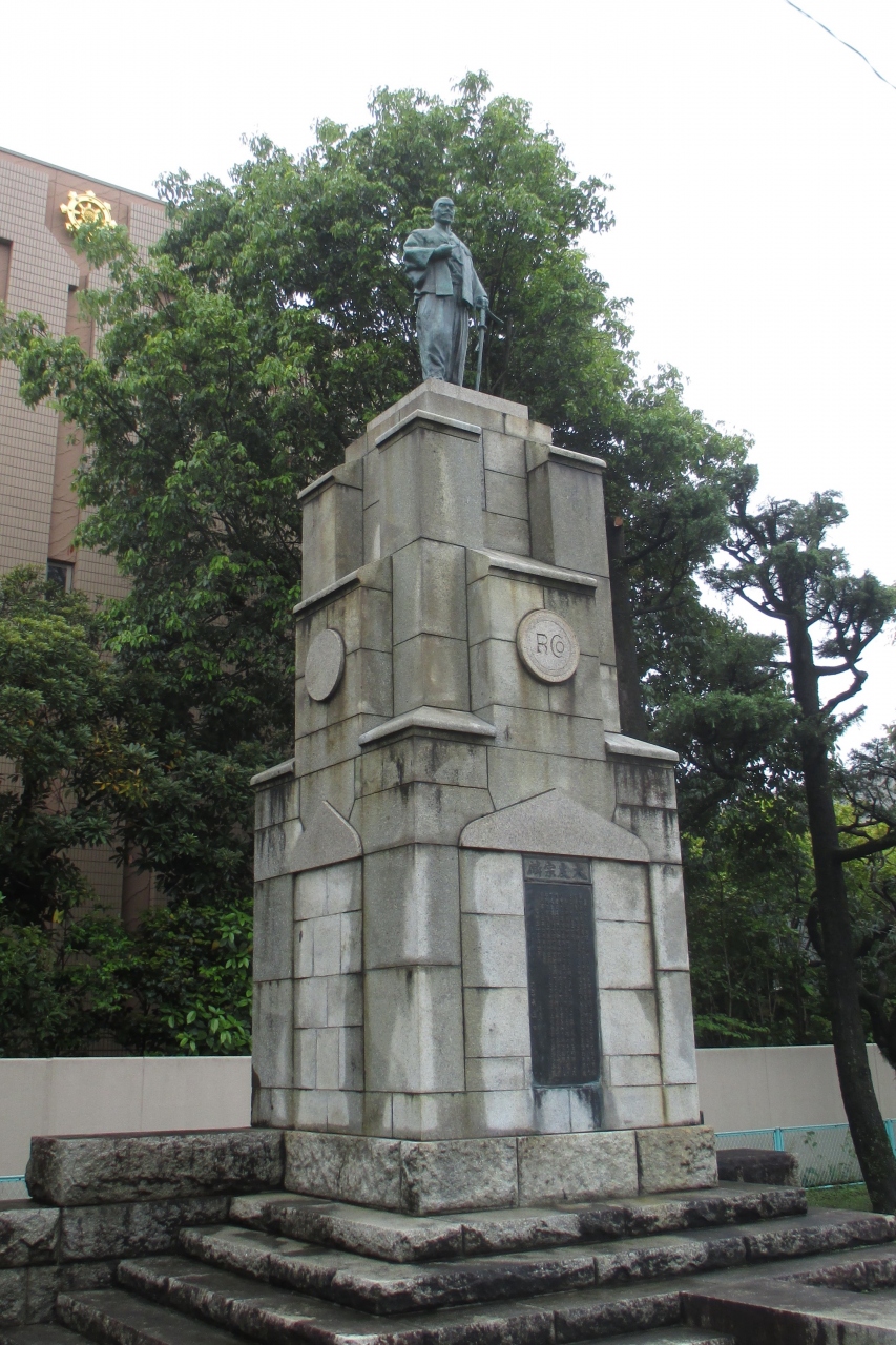 春日神宮の社殿の後ろに拡がる森を抜け、100m弱北に進むと県道22号線に出ました。その角のところに小振りな公園がありました。神宮寺浦公園です。太刀を杖代わり?にした大友宗麟像があり、その右方に「南蛮貿易場址」の石碑がありました。県道22号線はその昔の海岸線で、神宮寺浦と呼ばれた浜辺だったそうです。大友宗麟は、そこに南蛮貿易の交易所を設けたのだそうです。神宮寺浦の名はここに春日神社の神宮寺があったからとのことです。ところで、この銅像は1937年(昭和12年)に日名子実三さんによって制作されたのですが、戦時中の金属供出で一旦はなくなってしまったそうですね。日名子さんの遺族の家に残っていた原型を元に、長谷秀雄さんが1958年(昭和33年)に制作し直したとのことです。