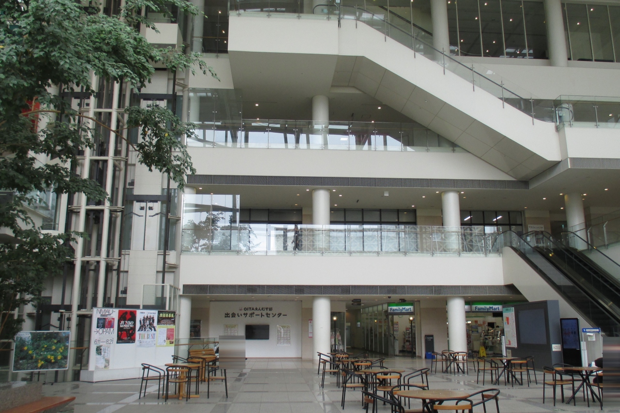 OASISひろば21は大分県立美術館と昭和通りを挟んだところにありました。とはいっても、昭和通りに面しているのはほんの一部という大きな施設で、コンサートホールなどを擁する総合文化センター、NHK、ホテルなどがあるのですね。通り掛かりにアトリウムプラザの寄りましたが、大きくて明るい空間でした。テーブルと椅子がたくさん置かれていて、何か飲み物でも頼まないといけないのかな?と思いましたが、自由に利用が出来ました。