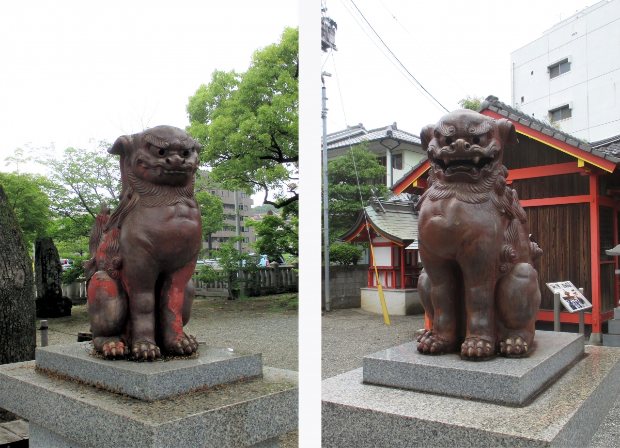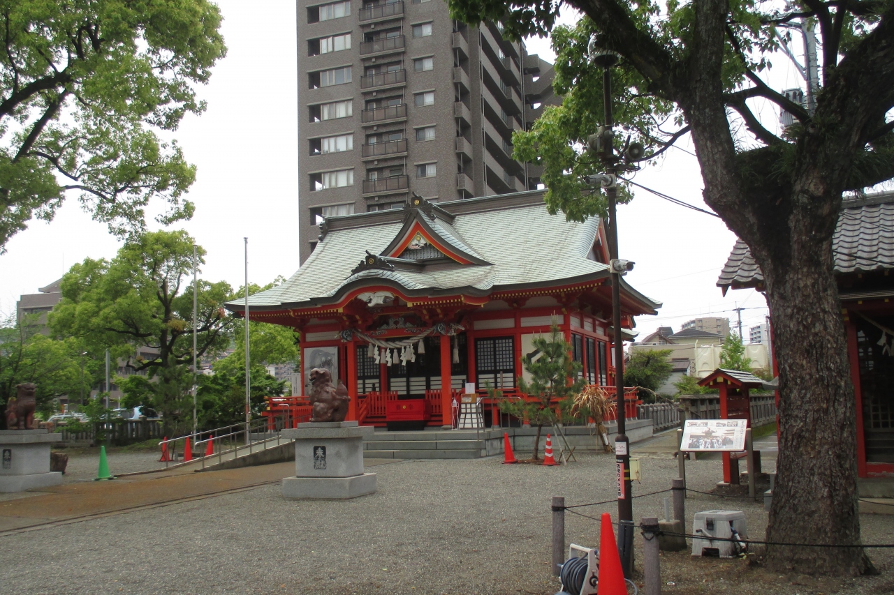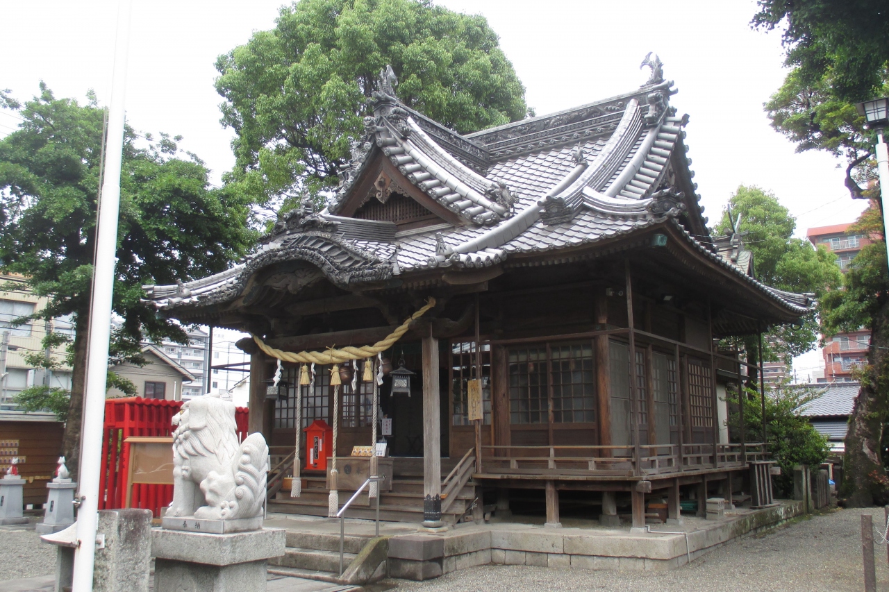 西新町の天満神社は、NHK大分放送局の少し東といったところにありました。1653年(承応2年)に、時の藩主・日根野吉明によって神殿が造られたとのことです。衰退していた近隣にあった笠和天満宮を再興させたものです。お参りに拝殿に近付くと、見事な細工瓦が見られました。その拝殿は千鳥破風の屋根の下に、唐破風が付けられた造りでしたが、そこに大きな龍の鬼瓦が乗り、その下は鱗模様と波模様が付いていました。左右には胴長?の狛犬も見えました。軒瓦には天神様の紋・梅鉢が配されていました。また、彫刻も龍や鳳凰など見応えがありました。