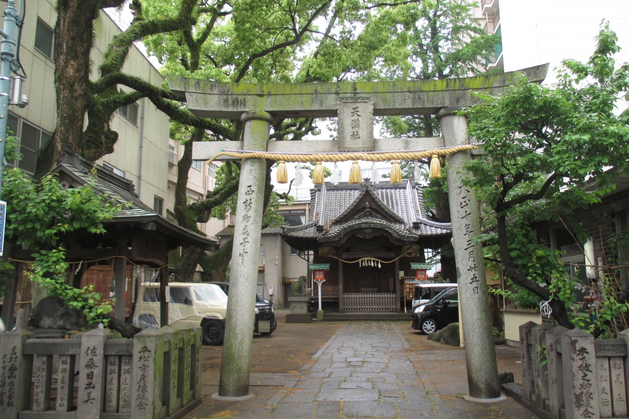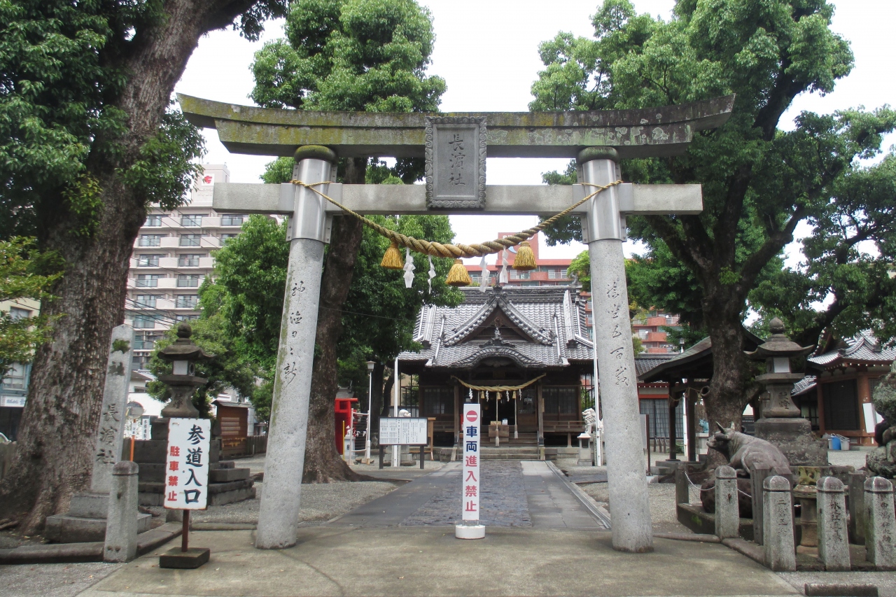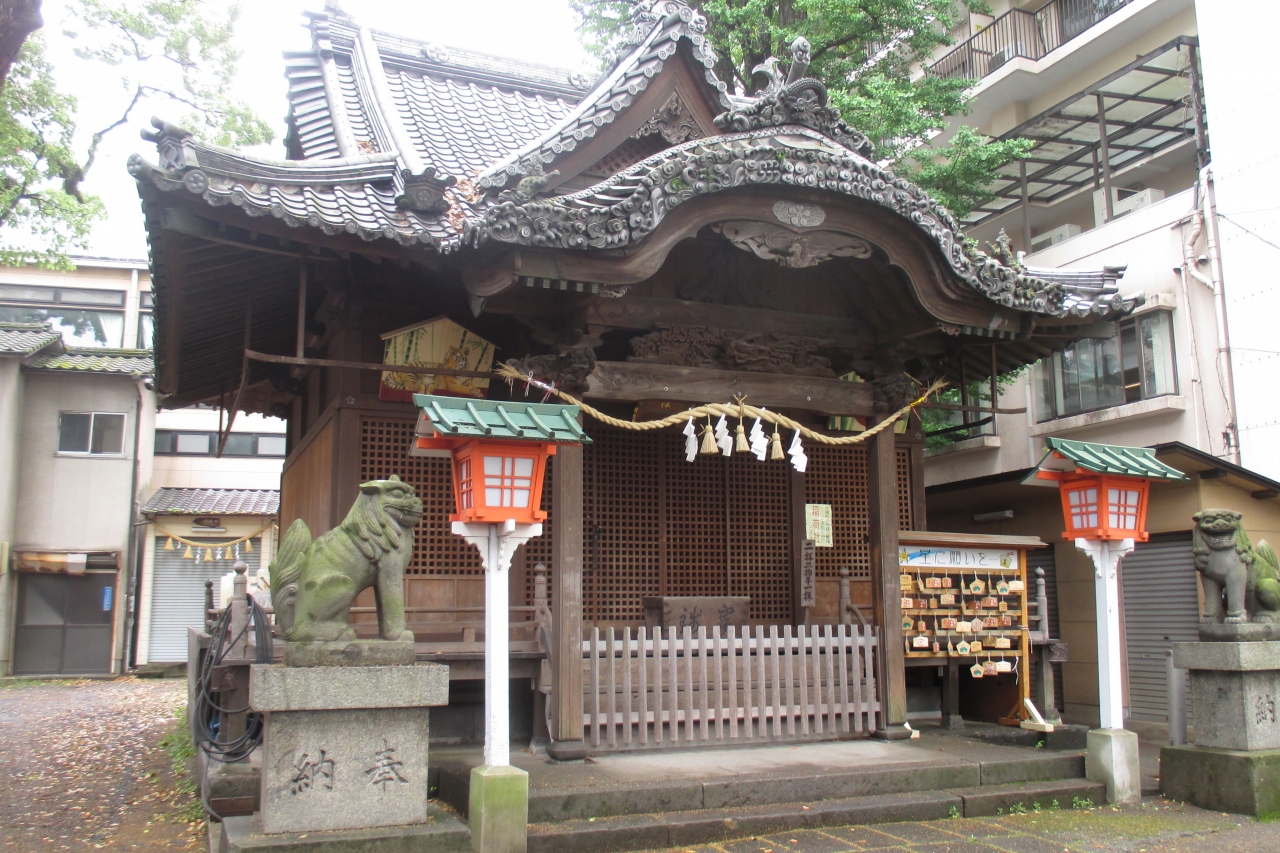 西新町の天満神社は、NHK大分放送局の少し東といったところにありました。1653年(承応2年)に、時の藩主・日根野吉明によって神殿が造られたとのことです。衰退していた近隣にあった笠和天満宮を再興させたものです。お参りに拝殿に近付くと、見事な細工瓦が見られました。その拝殿は千鳥破風の屋根の下に、唐破風が付けられた造りでしたが、そこに大きな龍の鬼瓦が乗り、その下は鱗模様と波模様が付いていました。左右には胴長?の狛犬も見えました。軒瓦には天神様の紋・梅鉢が配されていました。また、彫刻も龍や鳳凰など見応えがありました。