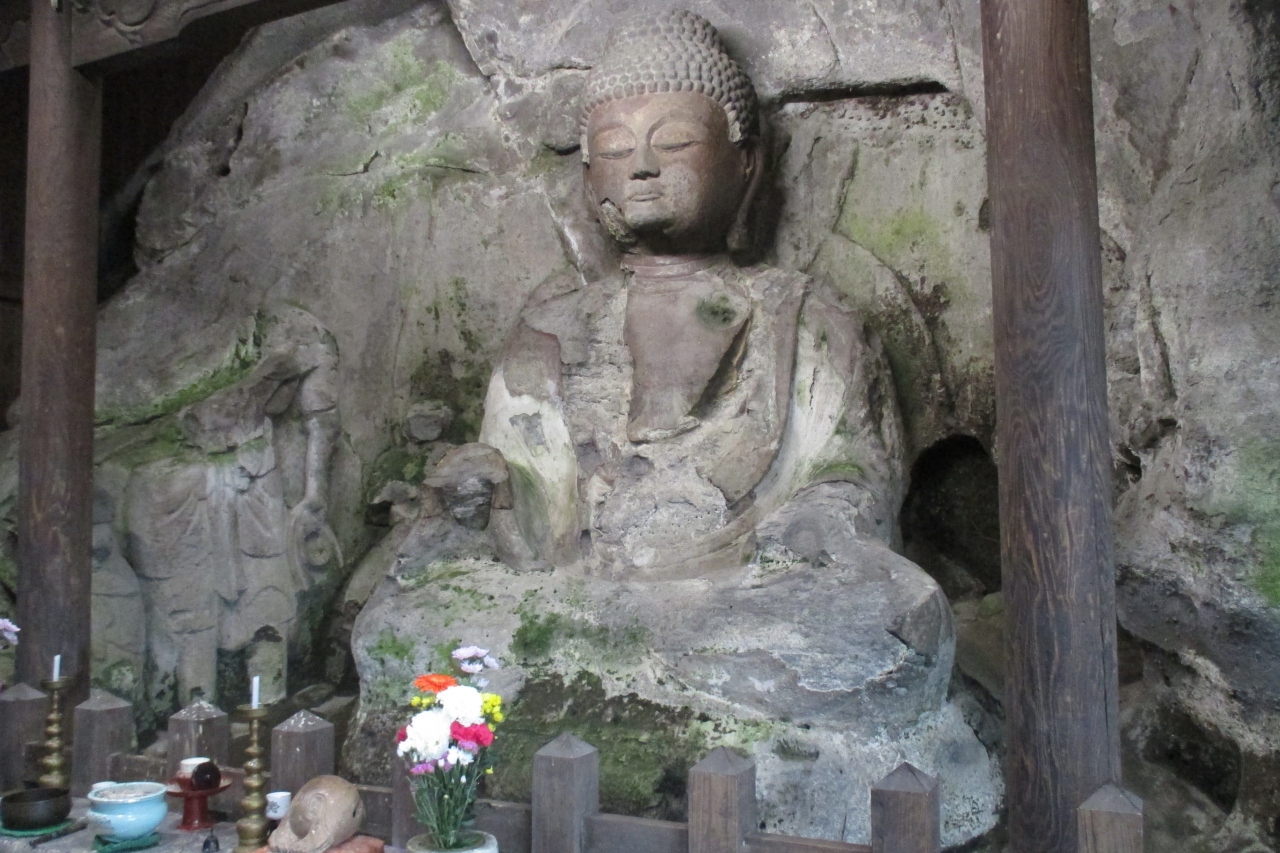 大分元町石仏は、上野丘の東南端部の麓にありました。大臣塚古墳の南方にありましたが、丘の上にあるか、麓にあるかといったところでした。覆い屋というよりもしっかりとした御堂が建っていました。堂内に入ると、中央に薬師様が穏やかな眼差しでおられました。左に多聞天、右に不動明王などが彫られていたそうですが、それはよく分りません。11世紀後半の彫像だそうですが、この辺りは宇佐神宮の領内だったのだそうです。