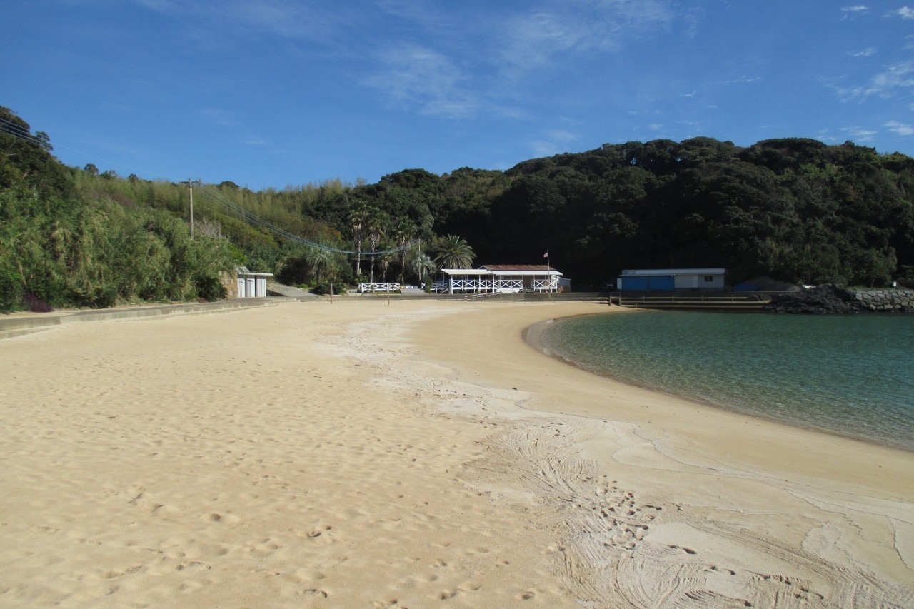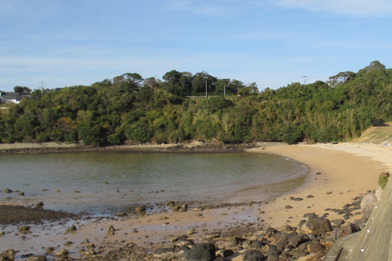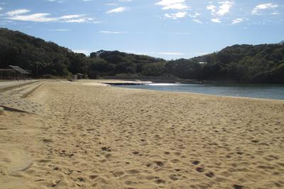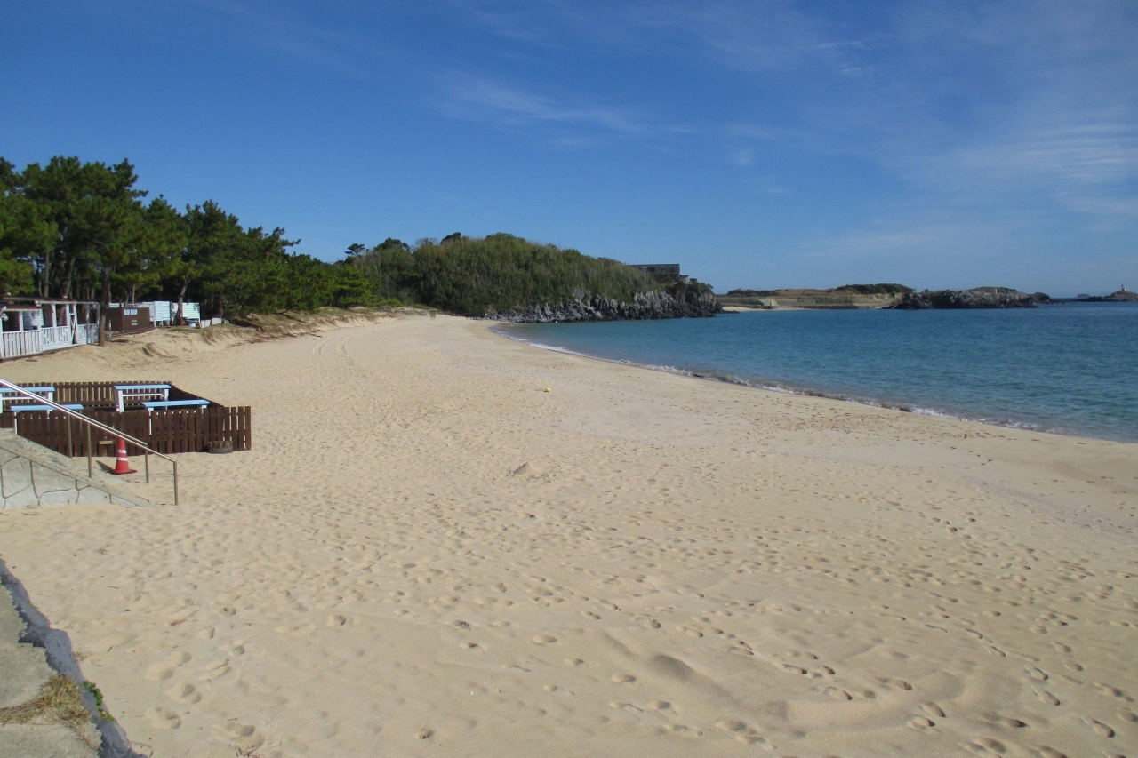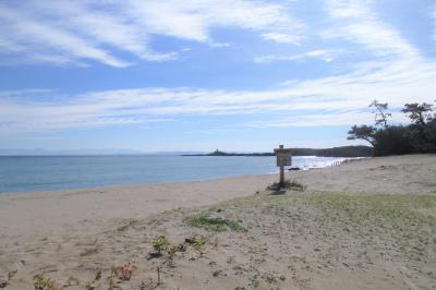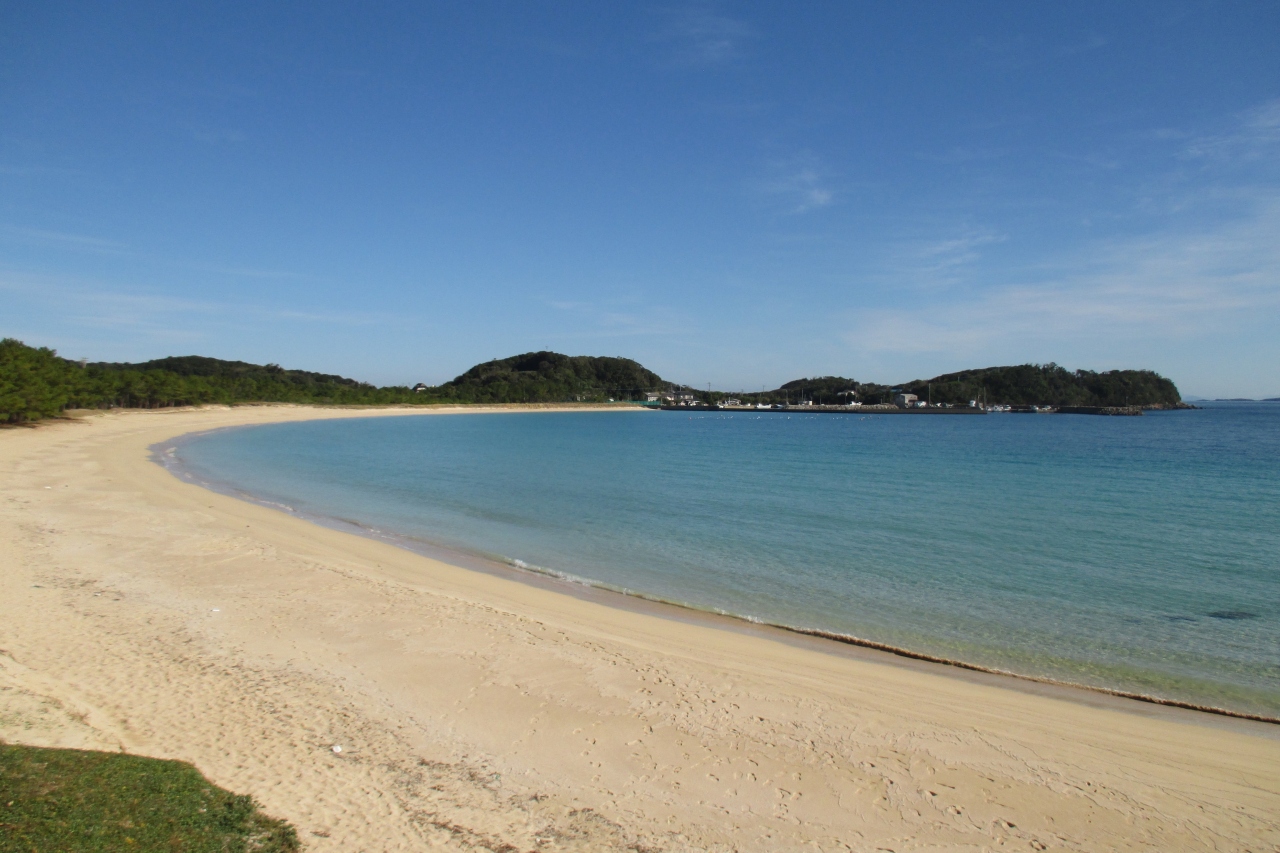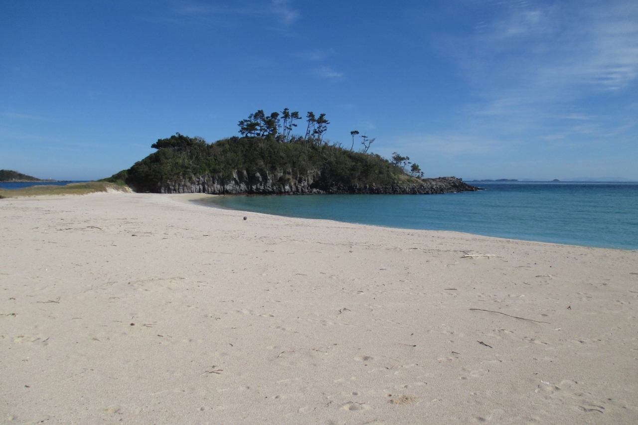 壱岐空港の東隣、筒城浜からは800mくらい南へ進んだところに大浜海水浴場がありました。こちらも白砂のビーチです。道路に接する砂浜は200mくらいの長さですが、岩場を挟んだ、もう1つの砂浜が200mくらいあります。ビーチのはるか前方には九州・福岡?の山並みが続いていました。