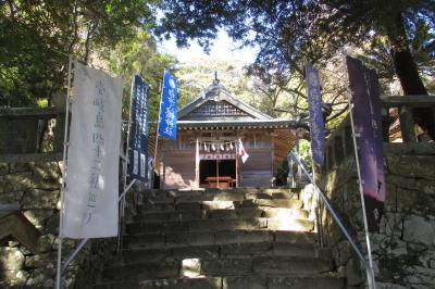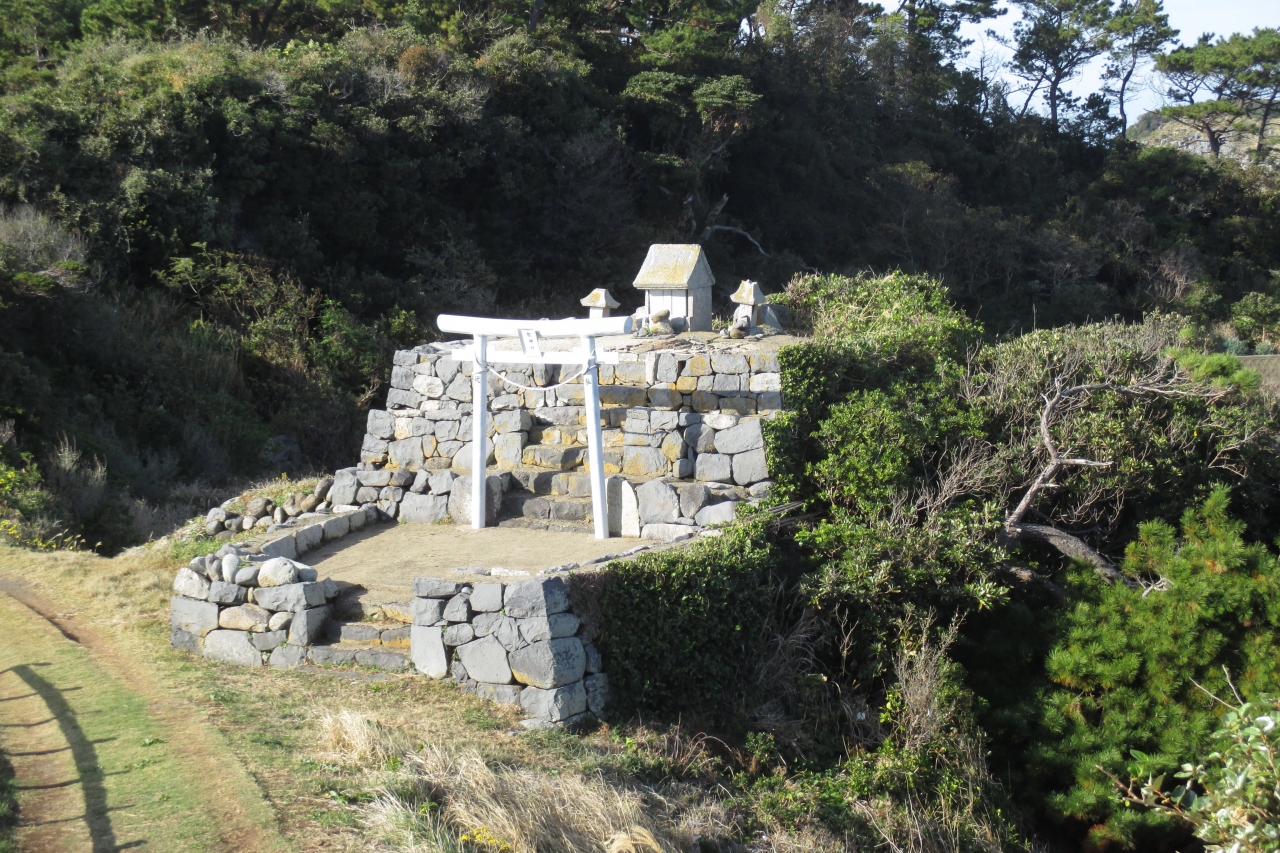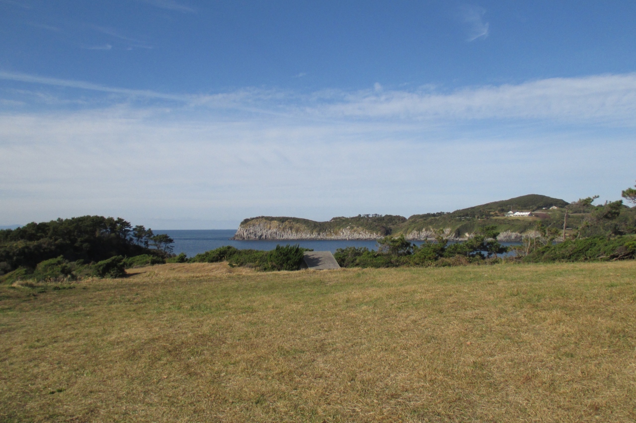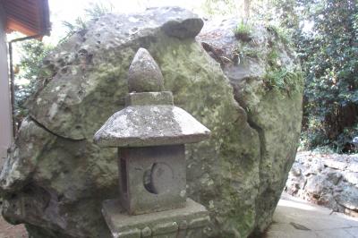 小牧崎公園に向かう途中で、爾自(にじ)神社にお参りしました。本殿裏に廻ると、「東風石」の扁額が掲げられた赤い鳥居があり、2つに割れた大きな東風石が祀られていました。全体では、横幅3.4m、高さ2.7m、周囲は11.5mもあるとのことです。神功皇后が三韓征伐に向かう折、海上の順風を祈ったのだそうです。すると、この石が2つに割れ、そこから東風が吹き出し、無事に渡海が出来たといわれているそうです。対馬では、神功皇后が三韓征伐から戻ってきた時の縁の場所を2つ訪れましたが、ここは往路に立ち寄ったところでした。