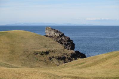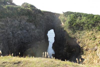 壱岐島西海岸の牧崎(牧崎園地)に景勝地・鬼の足跡がありました。大きな縦穴の海側のところに穴が開いていて海と繋がっていました。大きな海蝕洞窟の天井がなくなった様にも見えます。といっても、天井に開いた穴の周囲は110mあるそうですから巨大です。