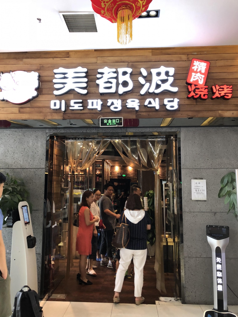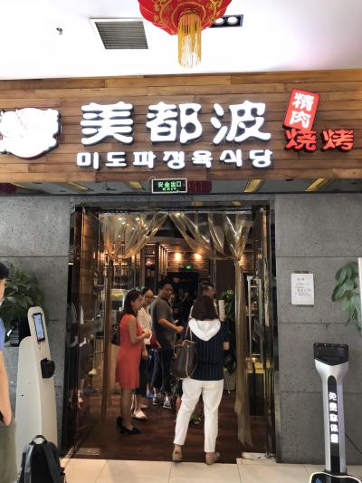 朝陽区望京地区での韓国焼肉店です。望京地区は有名な韓国人街なので、焼肉だけでなくスーパーや衣料品店も韓国製品を主体に取り揃えている店が多くあります。そんな地区でひと際流行っている焼肉屋がこの美都波烤肉です。店の入口の店員さんに人数を言って、順番待ちします。日曜日の12時過ぎに行ったこともあり、20分くらい待って入場です。韓国焼肉屋では当たり前の無料の小鉢ですが、ここの店は何と10種類くらいあり、すべて食べ放題です。ご飯とスープまでサービスです。お肉2皿とまぜまぜご飯?とビールを注文して145元でした。