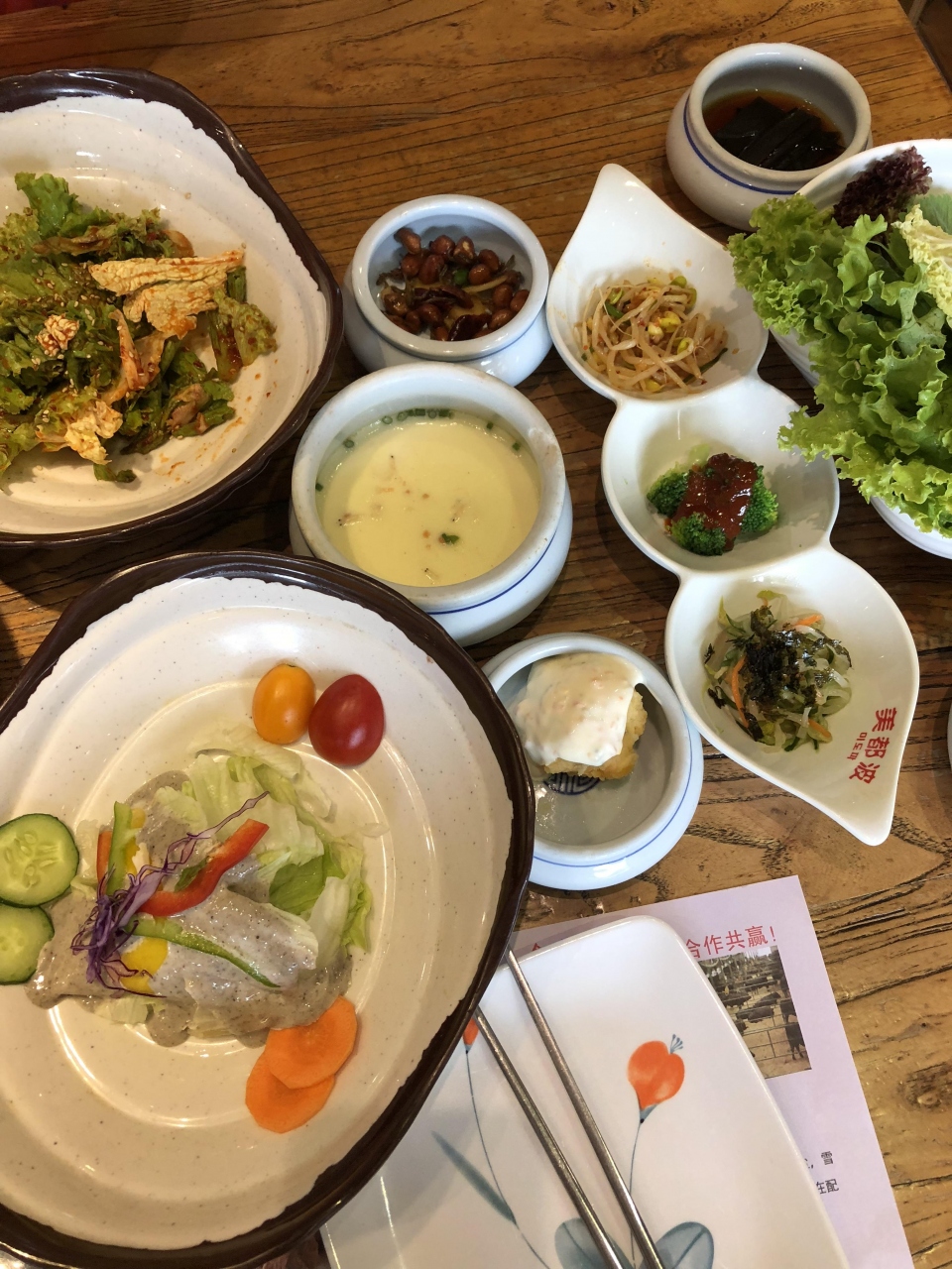 初めに多くの韓国焼肉屋と同じように、たくさんの無料の小鉢が目の前に並べられます。もうこれだけで、あとはライスがあればもういらない!って感じです。ディナータイムはとても高そうですが、ランチは65元位でリーズナブルです。デザートのアイスクリームも付いてます。たしかフルーツも付いてたと思います。お肉はとても柔らかく、納得の味です。