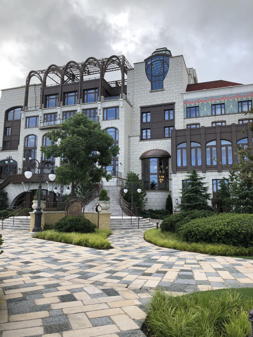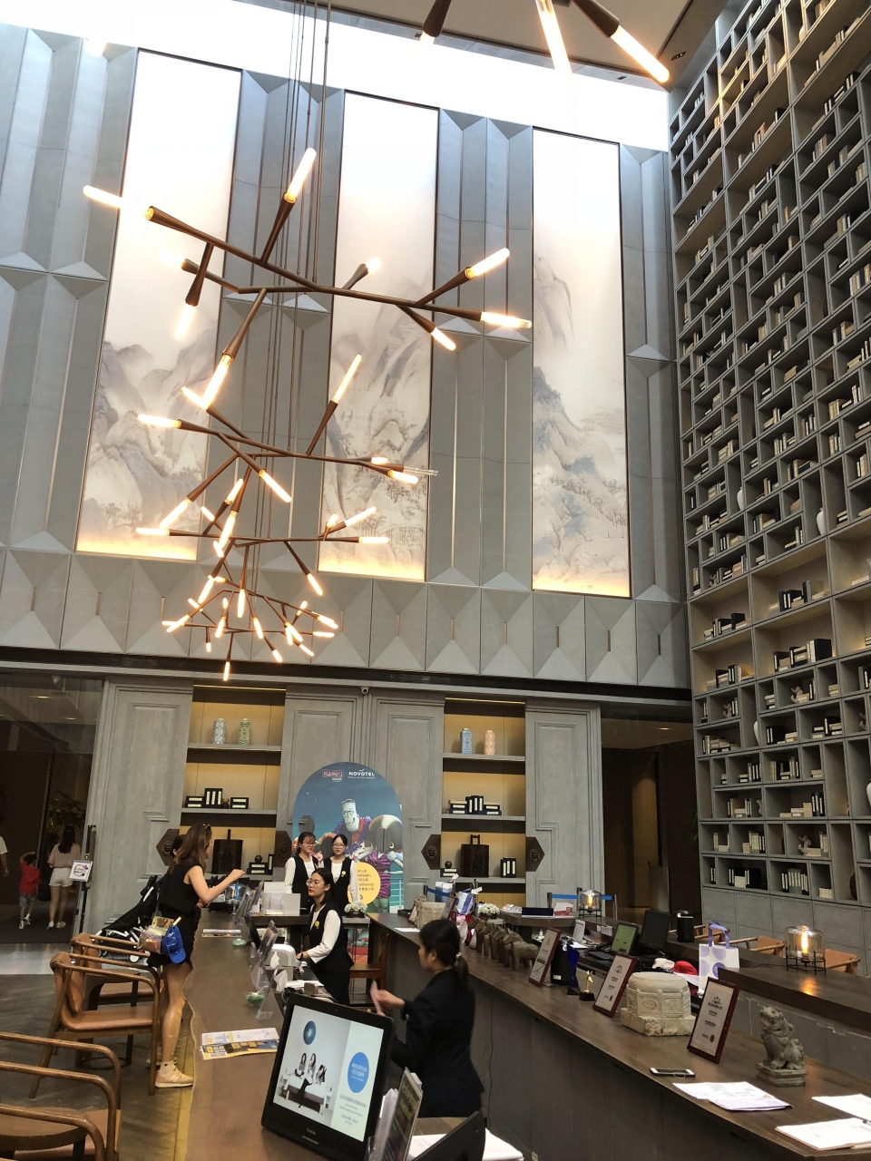 タイトルどおり上海ディズニーランドに行く前日に1泊利用しました。中心部からはとても離れていて、周辺には食事をするお店もコンビニもありません。食べ物飲み物の類は最寄りの駅で調達することをお勧めします。ホテルの近くにコンビニ(便利店)があるという口コミがあったので探しましたが、今はないようです。チェックインは座って、対面で行います。とても天井が高く、壁一面に本棚があり洋書に囲まれた、とてもおしゃれなフロント空間になっています。翌朝のディズニーランドまでのシャトルバスの予約はチェックインの時に行いました。
