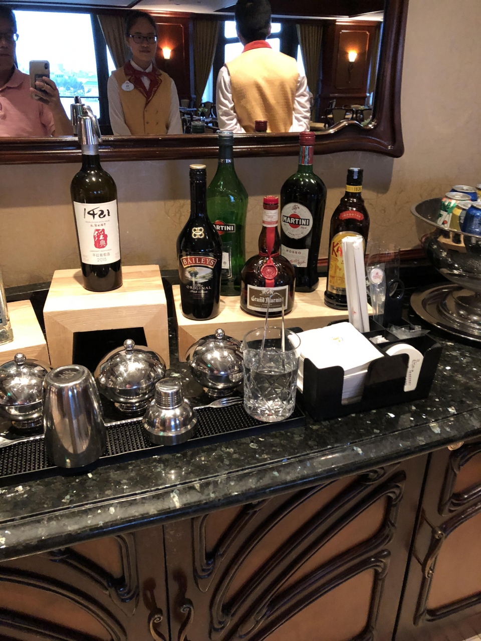 康新公路駅にあるノボテル上海クローバーから朝一番のバスで上海ディズニーランドに移動。早朝でしたがスムーズチェックインを終了し、ホテルのバスでディズニータウン宿泊者専用入り口から入場することができました。クラブレベルでの宿泊なので午後3時くらいにはに一旦ホテルに戻りクラブラウンジでコーヒーとケーキをいただき、午後6時過ぎからはお酒と軽食をいただきました。軽食といっても小鉢に入れられた豊富な料理で、お腹はいっぱいです。食後はもう一度夢の国に行ってきました。