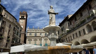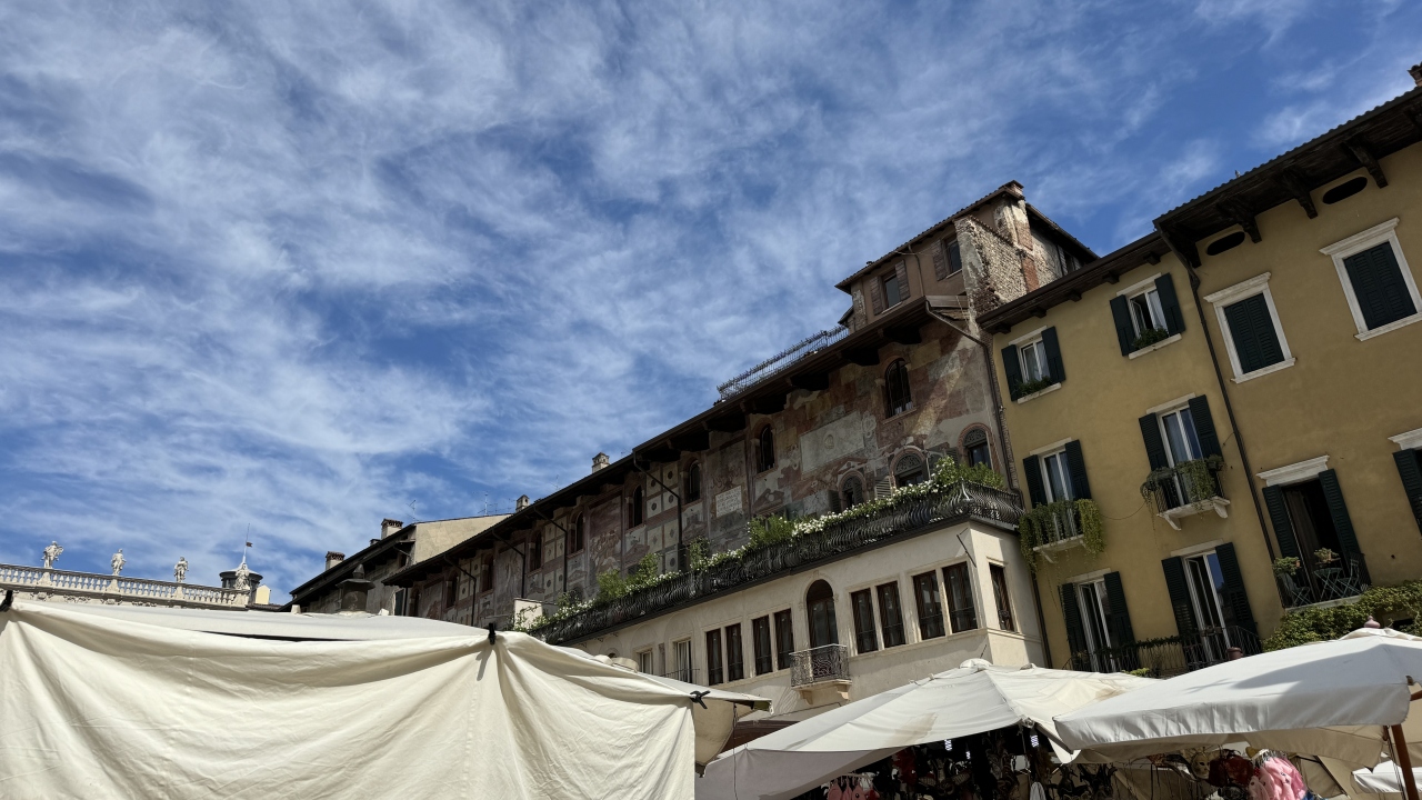 ベローナの旧市街地の中心地という雰囲気です。歴史を感じる雰囲気です。ここにはメルカートが出ていました。果物やさんとかチーズ屋さんというよりもおみやげやさんがメインだったので毎日出ているのかな。さすが観光地ですね。