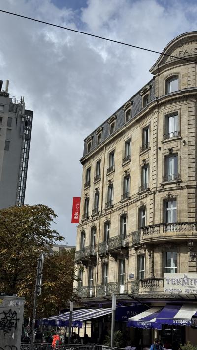 ボルドーの駅近くにあるビジネスホテルのイビスです。パリから入ってくると駅はここを利用します。トラムもすぐ乗車できて、すぐ街中にも到着できてとても便利です。ホテルはシンプルでとても快適にステイできました。