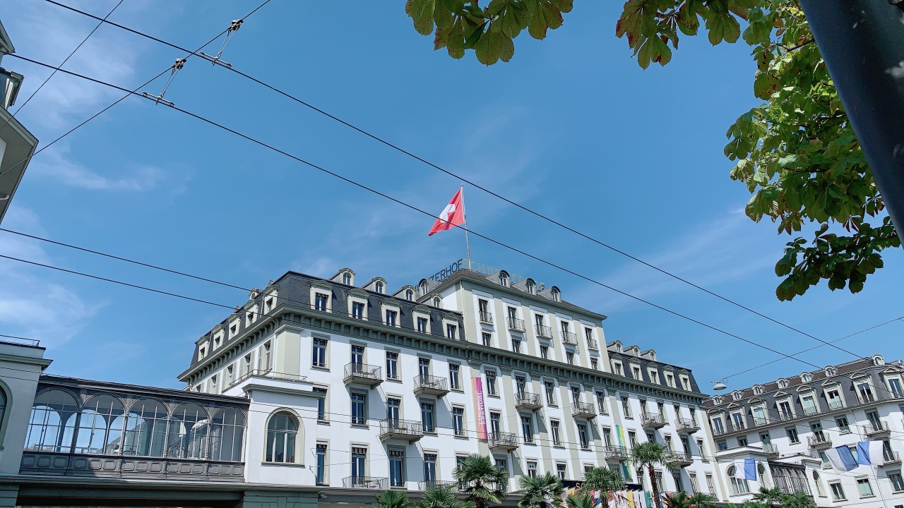 レイクビューのできる五つ星のホテルです。世界中の万国旗がゆらめいています。目の前はルツェルン湖がありますし、最高のロケーションんです。館内も気持ちの良い空間です。まさにホスピタリティの賜物という感じのサービスです。