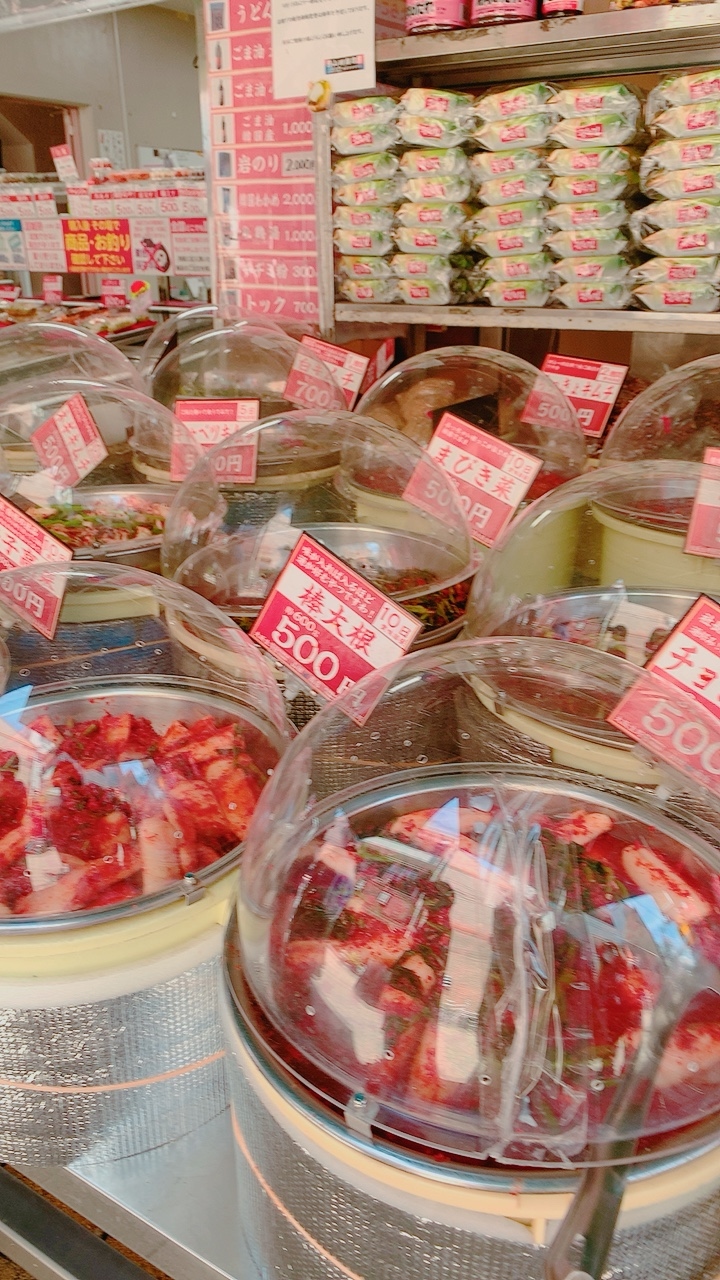 友人に教えてもらったキムチのお店です。わかめや蓮根などあらゆる野菜や海藻がキムチとして販売されているんです。500グラムで500円。明瞭会計ですね。辛さもちょうどよく美味しい証拠にいつでも行列ができています