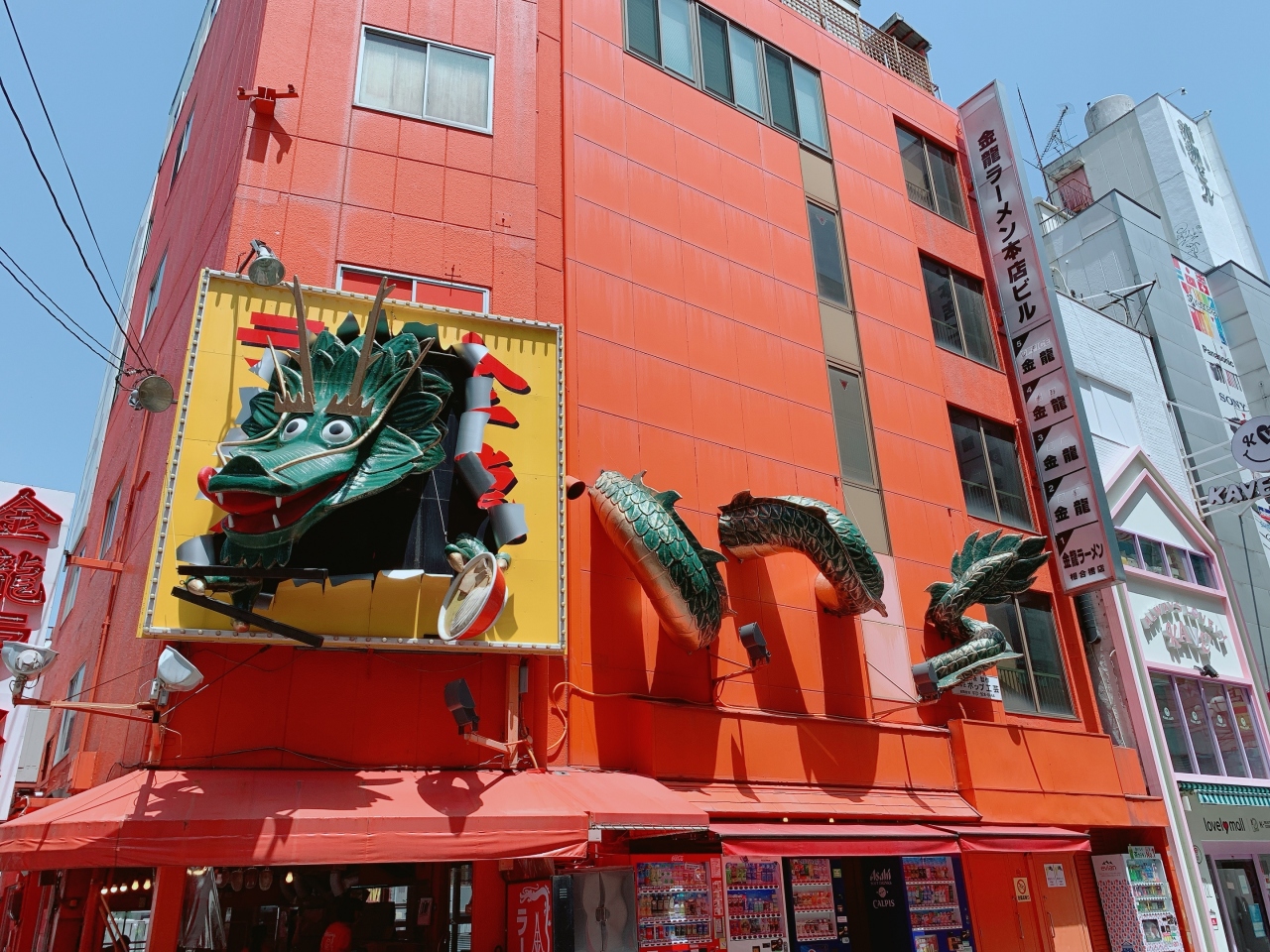 大阪の観光地、道頓堀名物の巨大看板。その一つが金龍です。龍が金のボールを咥えています。ここのラーメンは恋です。濃いので夜中にしめ要員としてとても混み合います。ひさしぶりに食べてこういうのやったと思い出しました。