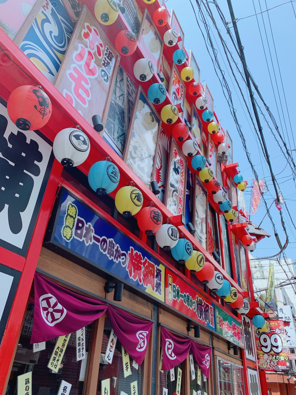 看板がとにかく派手ですので何やかわからなくても気になるお店です。ここは新世界にもある串カツ屋さんです。串カツはかなりカジュアルな雰囲気で味わえるんですよね。お相撲さんがたくさん並んでいる外観がとにかくいい