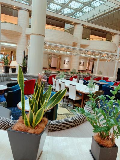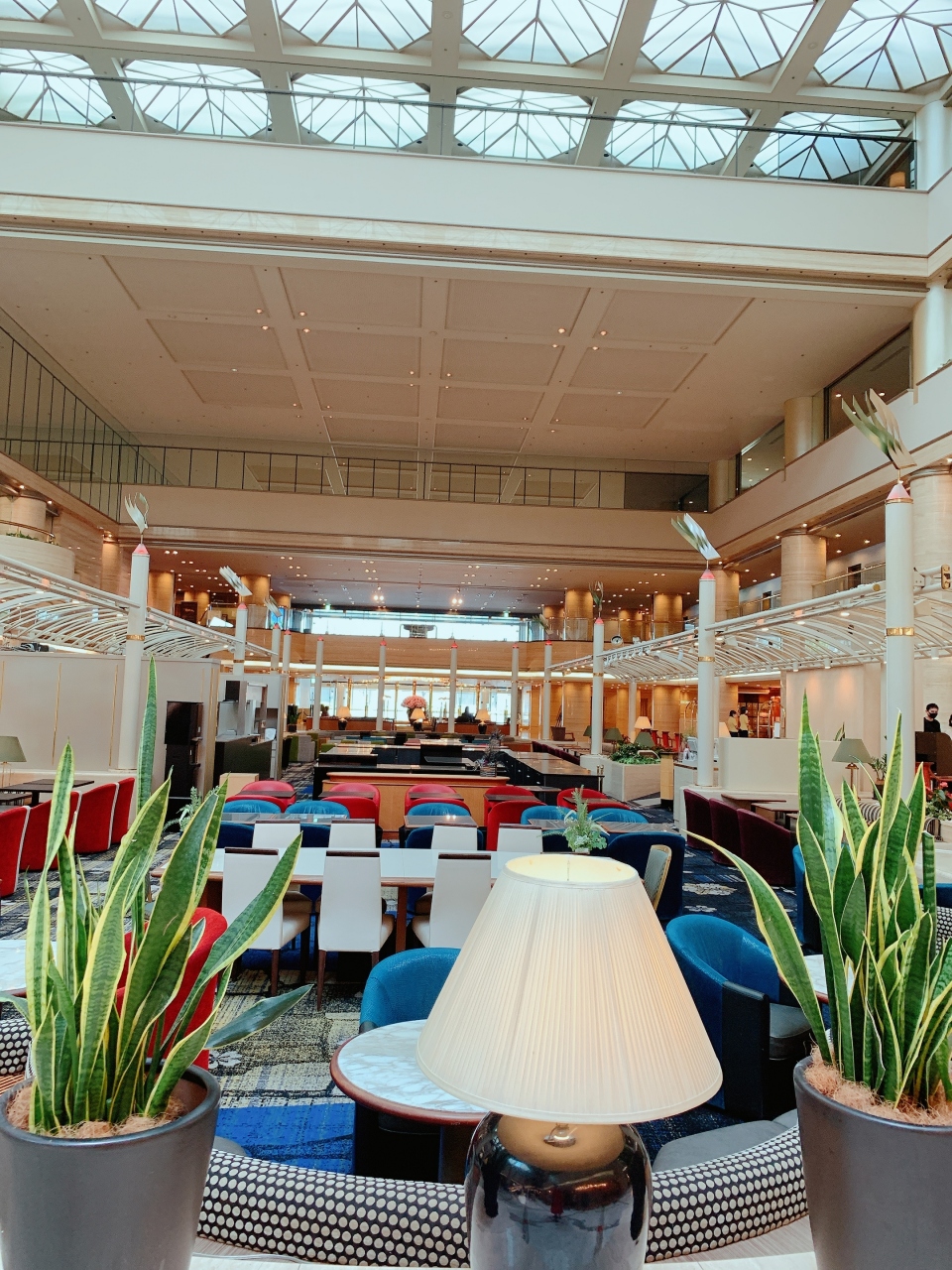 ニューオータニ1階のメインロビーのダイニングです。ここはいちごブッフェのときに何度か足を運びました。今回は宿泊して朝ごはんに利用しました。ブッフェです。おいしかったです。天井も高く開放感たっぷりでした。