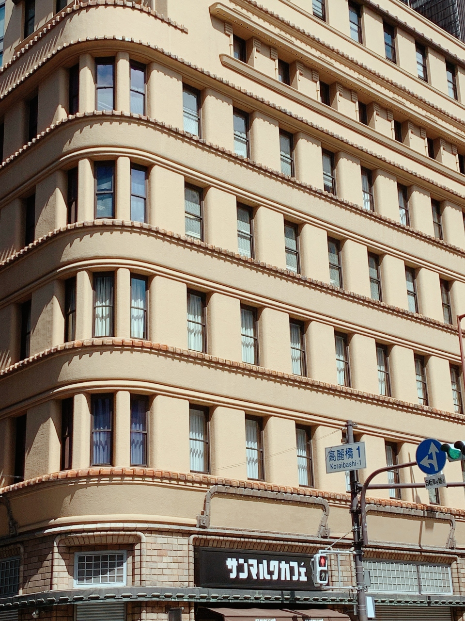 北浜界隈はレトロ建築の宝庫です。建物を見ながらのおさんぽもとても楽しいです。ここは1階にサンマルクカフェが入ったびるです。サンマルクカフェに入れば内装も見られてお得な気分になります。堺筋沿いにあります。