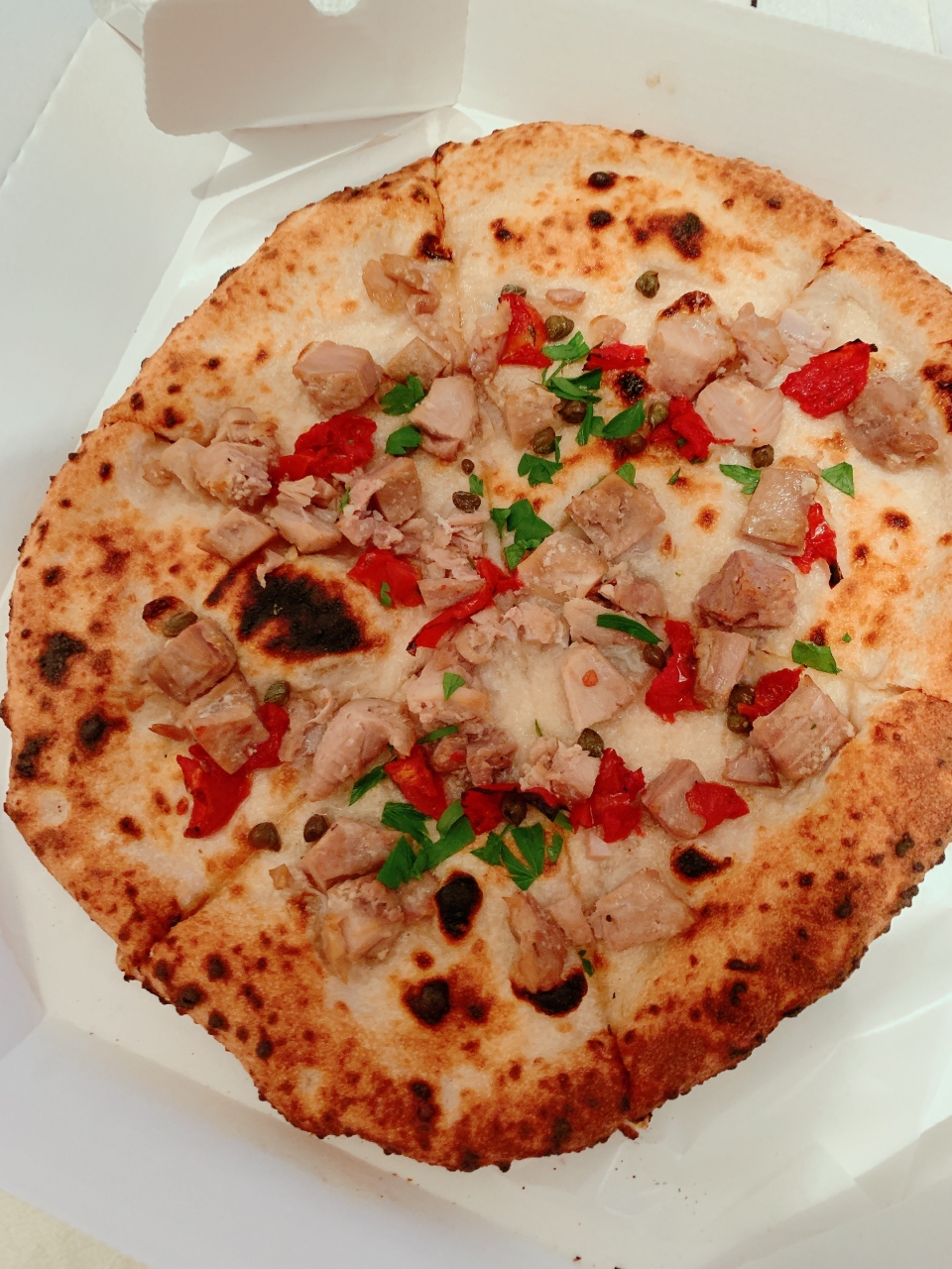 ロックダウンして以来ピザを食べていないことに気づいてしまい、そこから食べたいモードに突入しました。テイクアウトできると調べて、電話で事前予約でピックアップ。半分残そうと思ったのにぺろっと間食してしまいました。季節限定のマグロがおいしい。