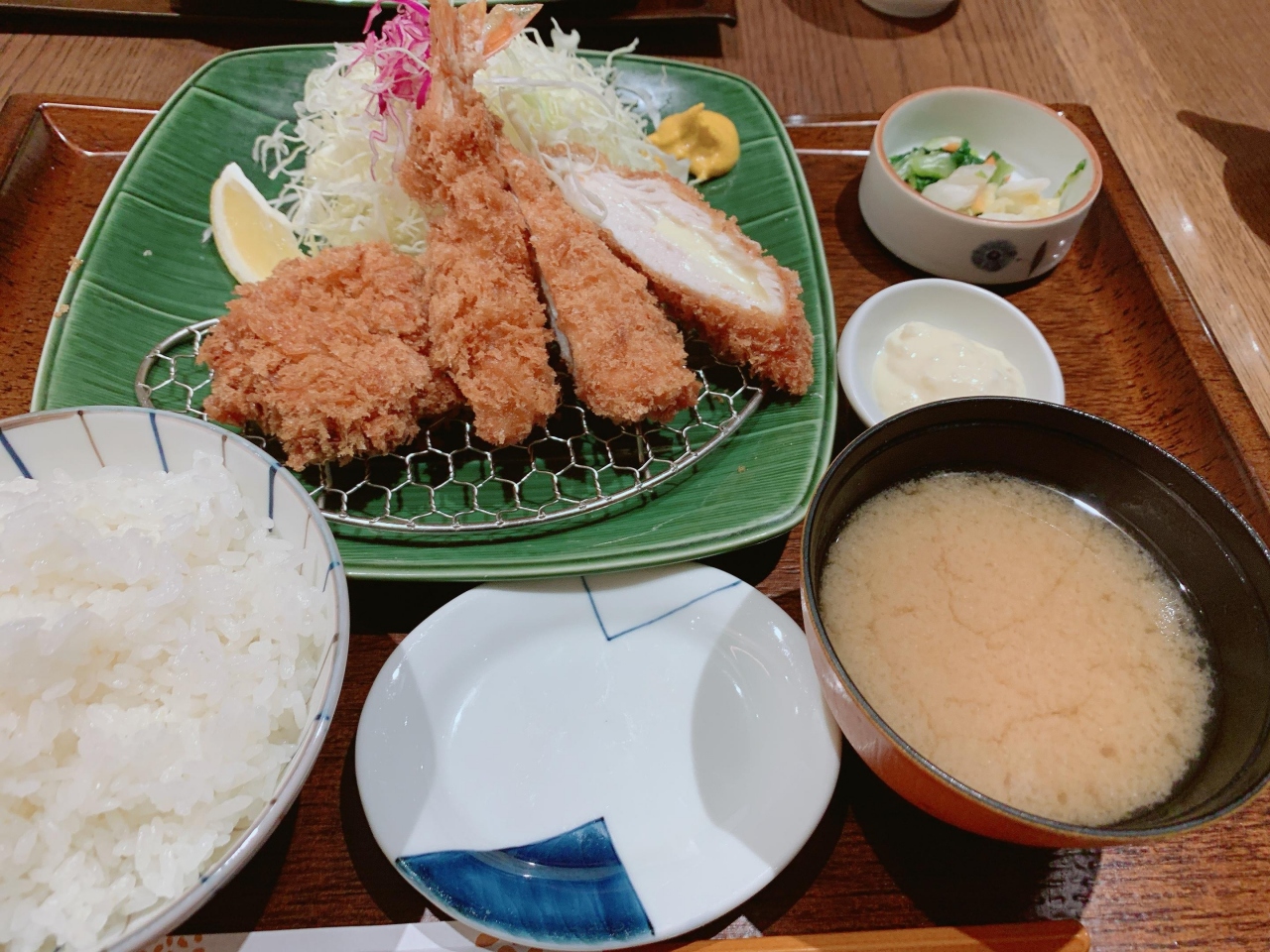 とんかつ定食を食べました。えびもチーズも入った盛り合わせをチョイスしました。キャベツもごはんもお味噌汁もおかわりOKなんですね。ドレッシングがさっぱりしていてキャベツがすすみます。久しぶりのとんかつはおいしいですね。