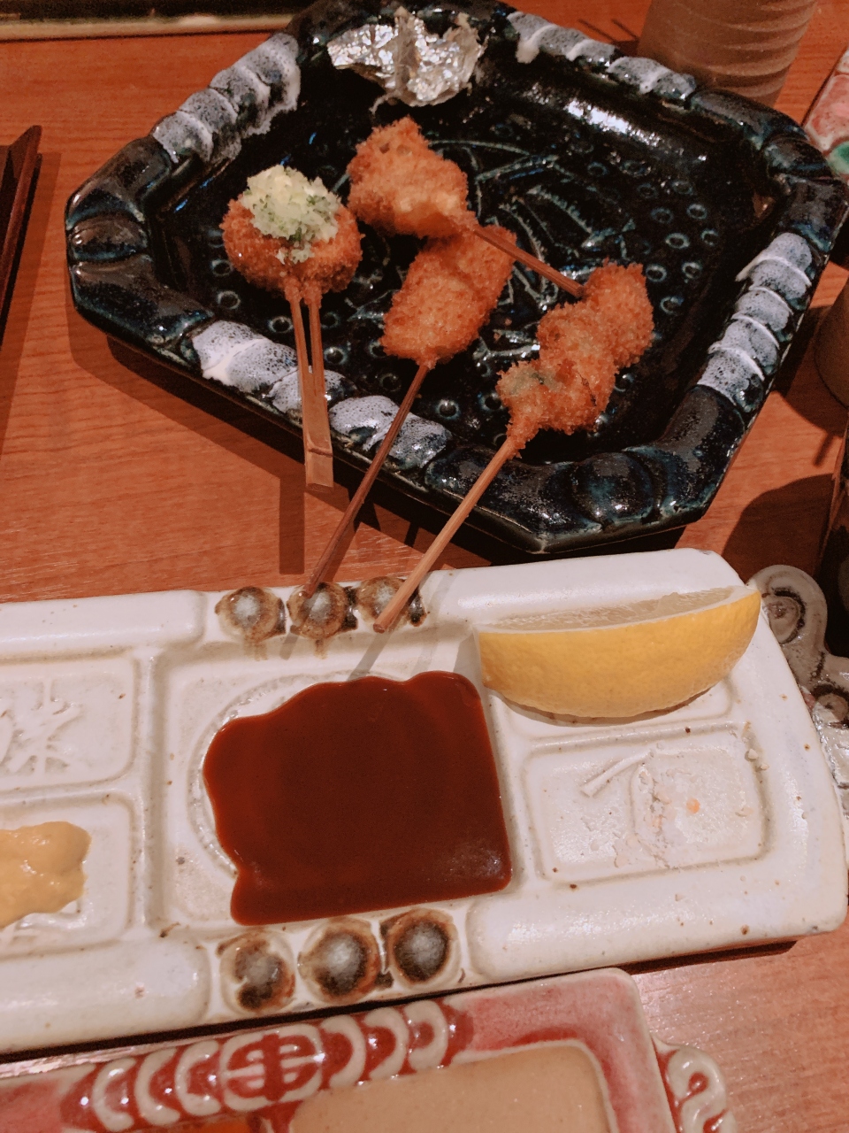 串カツを食べに行きました。かなりおいしかったです。陶器もすべて色が異なるなど手作り感がありますね。次々、串カツが登場します。やっぱり創作串カツっておいしいですね。しかもわいわい食べるのもまた楽しいですね。