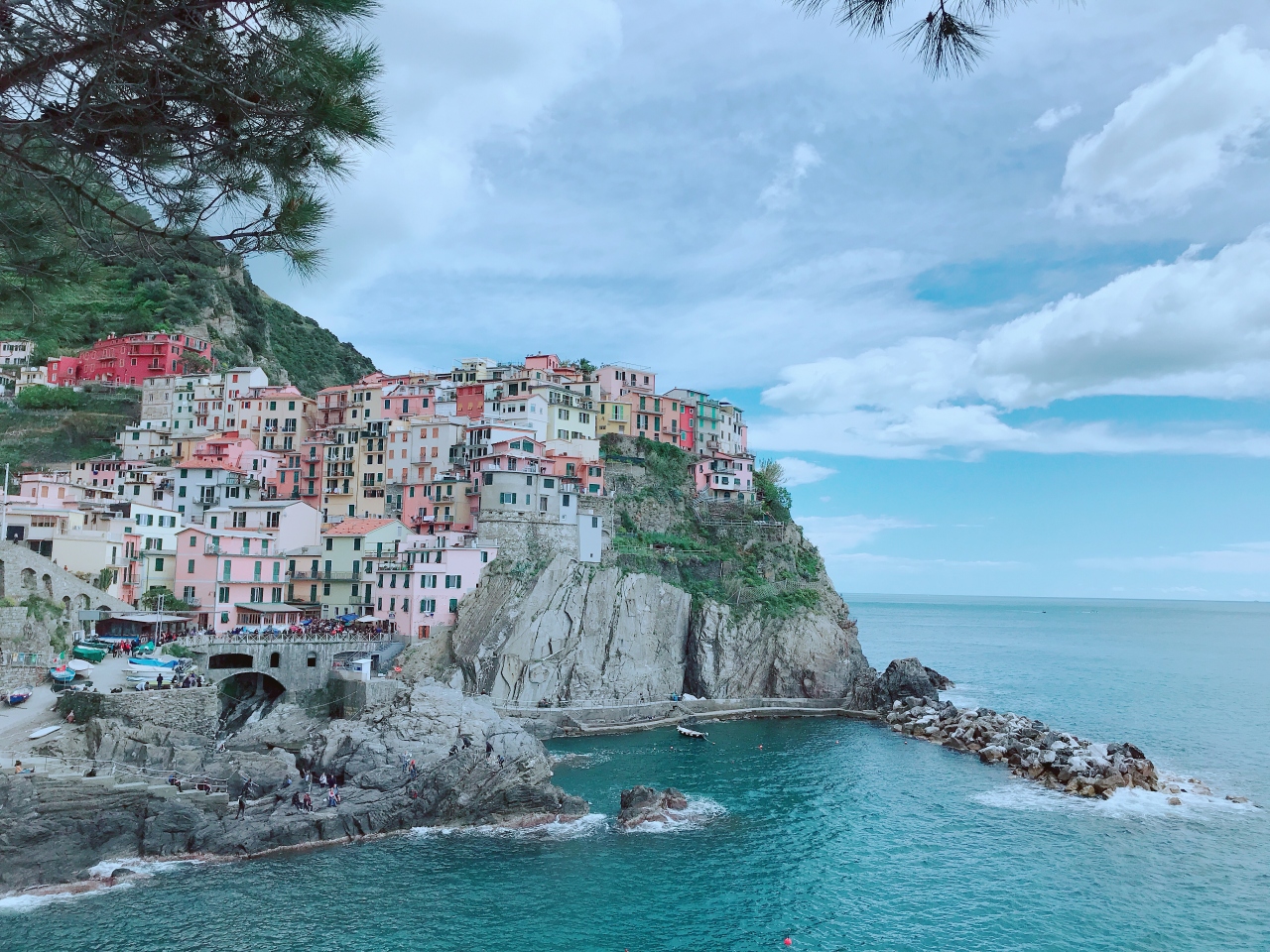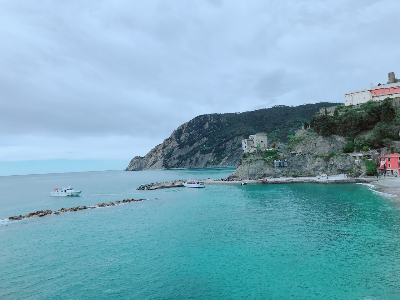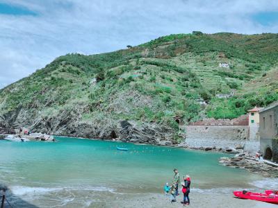 チンクエテッレを旅行中です。日帰りなんですけどね。目の前はもちろん海があります。曇り空は残念なのですがいい感じのリゾートち。トレッキングの人が多く、さらに団体のツーリストも多くとにかく混雑していましたね。