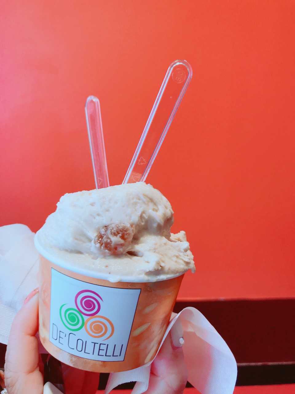 前から気になっていたドライフルーツやナッツのお店です。ジェラートがあると聞いて今回はジェラートを購入。トッピングしてくれるナッツがおいしいのです。そしてピスタチオのジェラートも味が濃くて素材が生きています。イートインもできる。