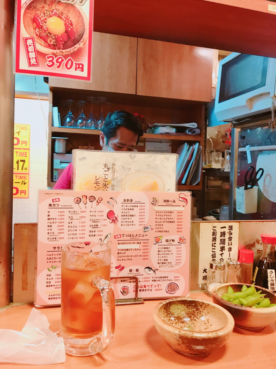 茶屋町で約束の時間より早かったので赤ちょうちんの居酒屋さんで休憩しました。カウンターだけだし狭いし、ほんでわたしの飲めるものなんてないしでかなり場違い。けど以外に刺身がおいしいのはびっくり。ほんま狭いです。