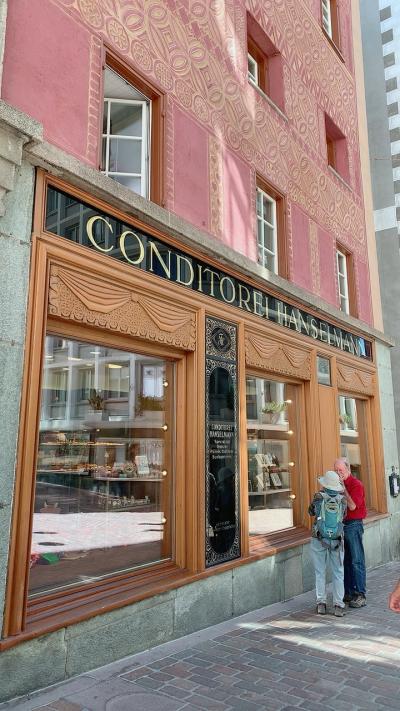 サンモリッツの中心地にあるカフェです。オードリーヘップバーンが通ったというので有名ですね。パンやケーキをテイクアウトもできますが店内の奥にはカフェがあります。スイスは物価高ではありますがどれも美味しそうです