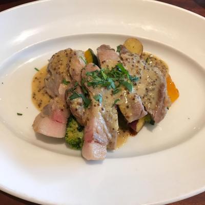 友人に予約してもらって日曜のランチへ。2300円の一種ですが、前菜とメイン料理が選べます。前菜はカツオ、メインはお肉にしましたが大当たりのおいしさ。そしてデザートのレアチーズタルトとバニラシャーベットが最高においしかった。