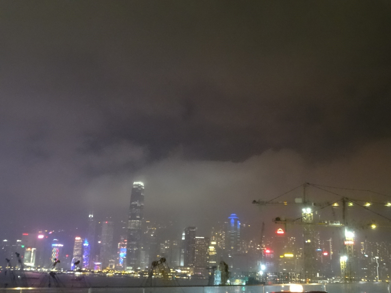 香港の夜を飾るショーといえば毎日20時に行われる光のショーです。九龍島から見えます。だけどこの日はガスがすごくて全然見えない。最終日だったのでとても残念です。音とともに輝く光にうっとりしたかったけど、次回にかけます。