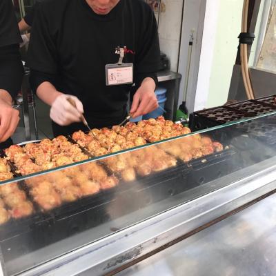 道頓堀でひときわ行列ができているたこ焼き屋さんです。並んでみたら段取りがよいので5分くらいで買えました。ハーフハーフにしてみました。わたしは塩が好みなのでうれしい。天かすがとてもきいています。中はとてもクリーミーです。おいしい。