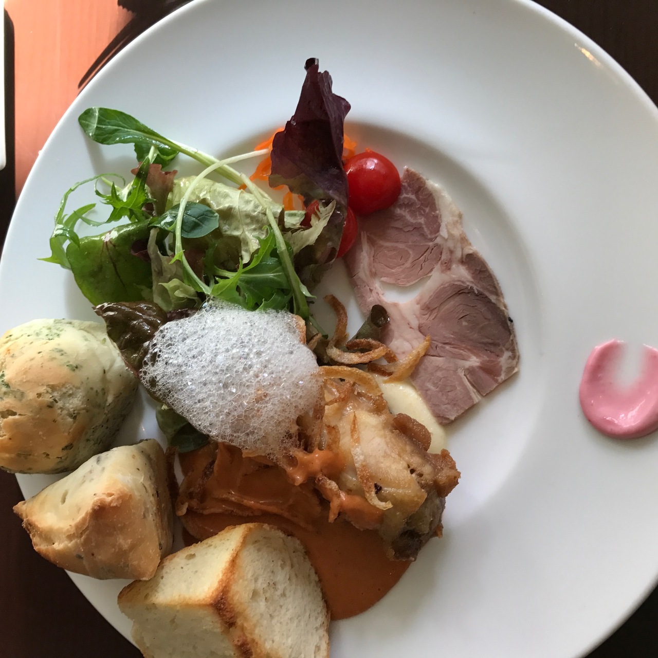 なんばに用事があったので道頓堀でランチを探していてこちらへ。2階にあるビストロです。平日のランチタイムは女性がたくさん。みなさんコースやシャンパンを優雅に食べている横でプレートランチ1000円をいただきました。自家製パンがめちゃおいしい。