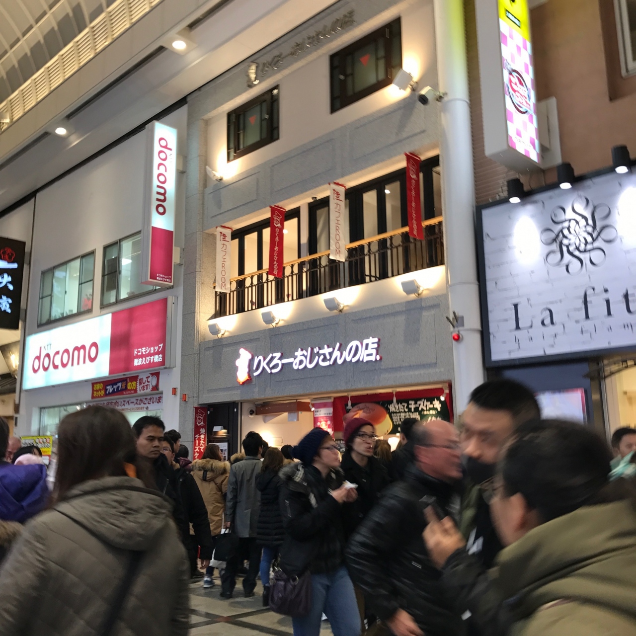 今も昔もまだまだ大人気のりくろーおじさんのチーズケーキです。戎橋商店街にもできていました。しかも行列ができている人気ぶりです。レーズンが入ったふわふわのチーズケーキは安価なのに美味しいです。とくにちびっ子に人気。