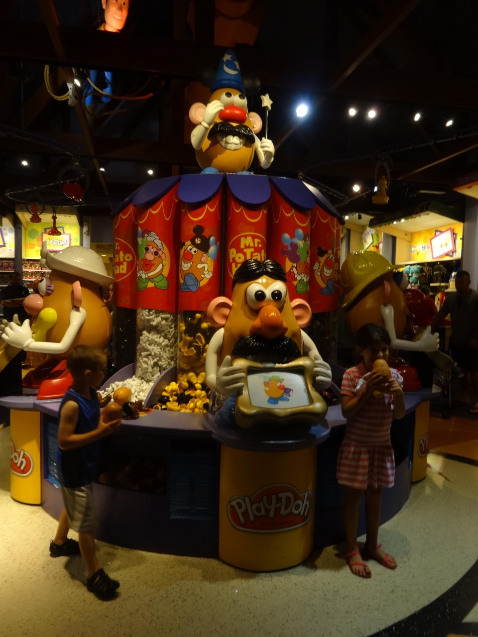 スプリングスないのおもちゃ屋さんです。ああ夢いっぱい。こちらの看板商品はカスタムして自分オリジナルを作成できるポテトヘッドです。とりあえず試してみます。がパーツが多すぎて放棄。もちろん店内は子どもたちでいっぱい。