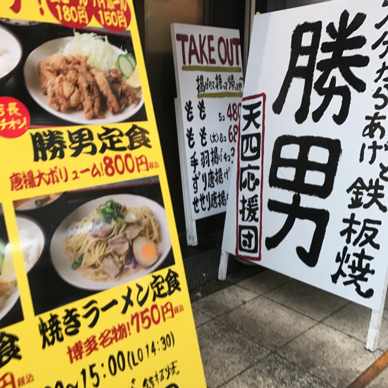 なかなかのパンチがある看板です。天神橋筋商店街内にあります。唐揚げと鉄板焼きのお店です。ガッツリな男飯ですね。看板見ただけで胃が重くなります。が、上手にチョイスすれば食べられます。ごはんがすすみますね。