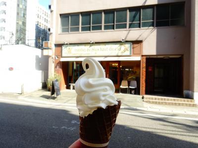 スイーツ王国神戸でもとくに人気なのが栄町にあるこちらのパティスリーです。とにかくいつでも店内にはマダムが大挙し、ケーキを食べています。ショーウインドウには美味しそうなケーキがずらり、けど暑い日だったのでソフトクリームを購入してみました。