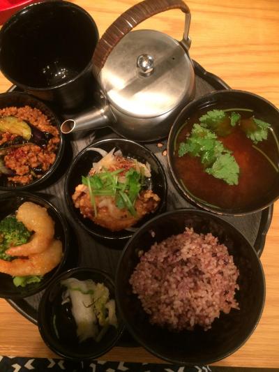 気に入ってリピート。またもや3種の小鉢を選べる定食をチョイスしました。20種近い小鉢から選べるのに結局同じようなものばかりを選んでしまいます。玄米に味噌汁もついていて気持ちヘルシーな感じでお気に入りです。