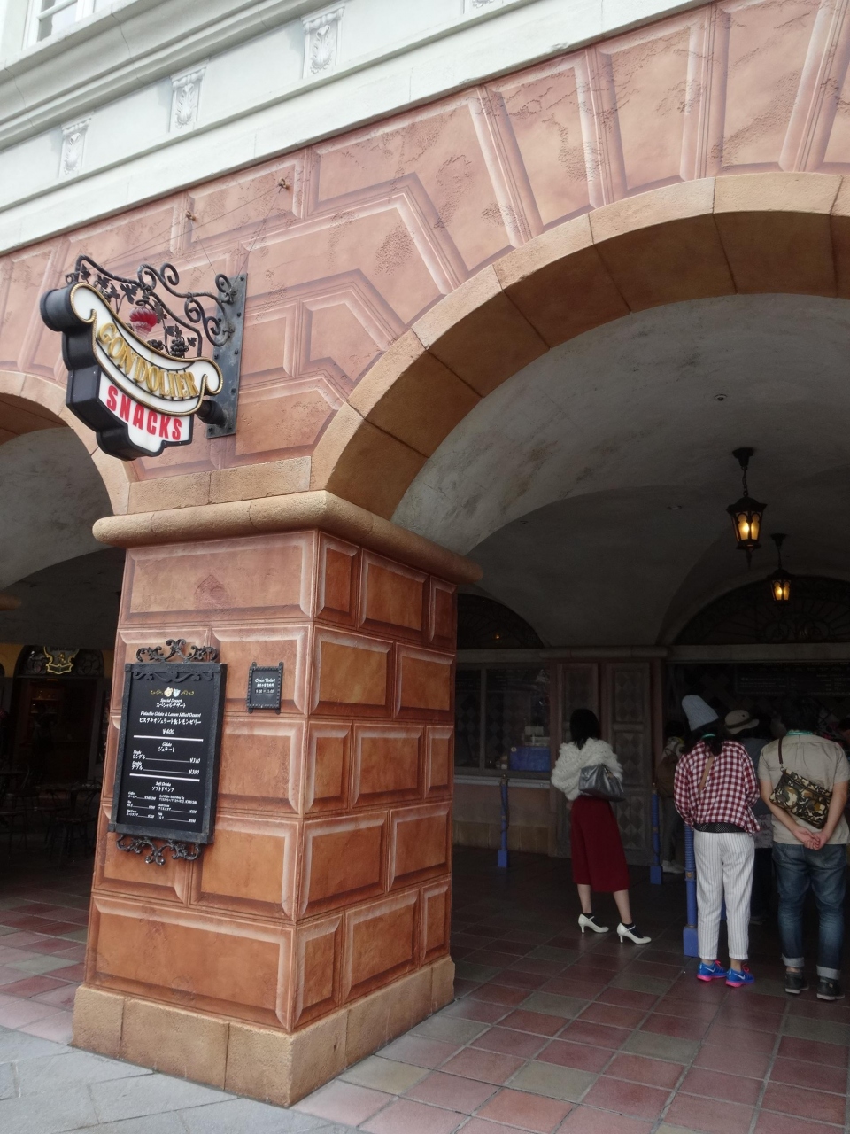 テイクアウトフードのカートです。主役は何といってもティポトルタ。サクサクしたパイ生地の中にクリームが入ったスティック状の焼き菓子です。ファンタジーランドにありカラフルな荷馬車がモチーフなので見つけやすいです。