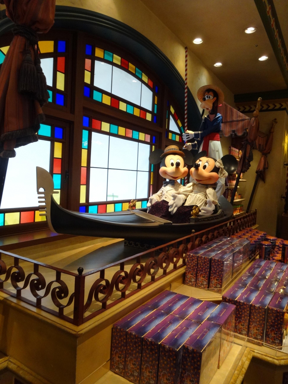 ディズニーシーの入ってすぐにあるお菓子の専門店。 キャンディーやチョコレート、クッキーなどのお菓子がいっぱい。もちろんパケ買い必至のかわいいものばかり。ゴンドリエに扮したグーフィー、ゴンドラに乗るミッキーとミニーのフィギュアがキュート。