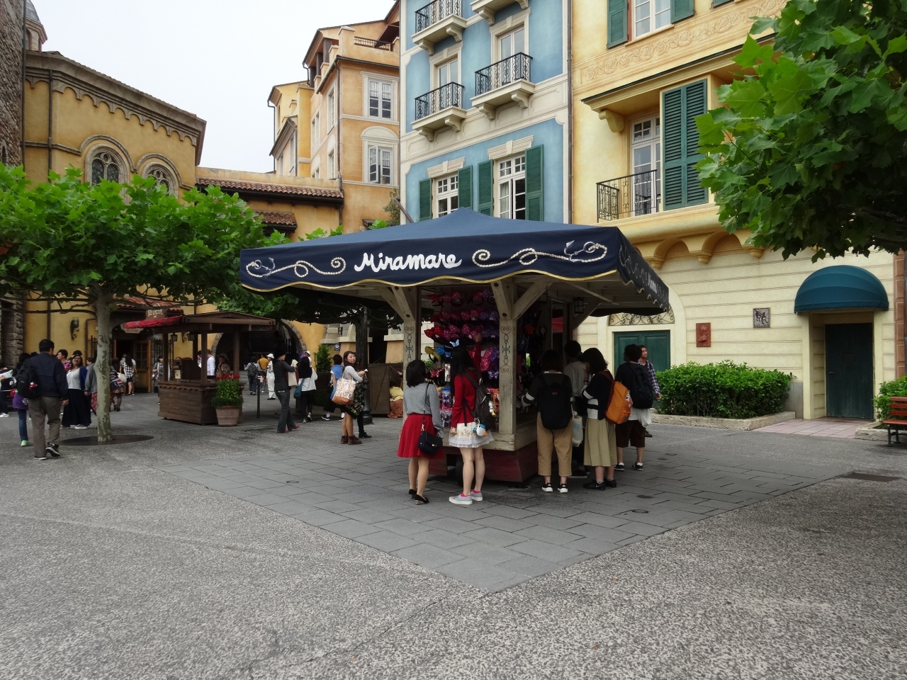 ラグーン前にある小さなワゴンショップ。ヘッドアクセサリーなどのファッションアイテムを販売しています。ショー用のグッズも多いです。季節によって商品は変わるのでのぞくたびに新鮮です。 ミラマーレは、イタリア語で海の眺めのことだそう。
